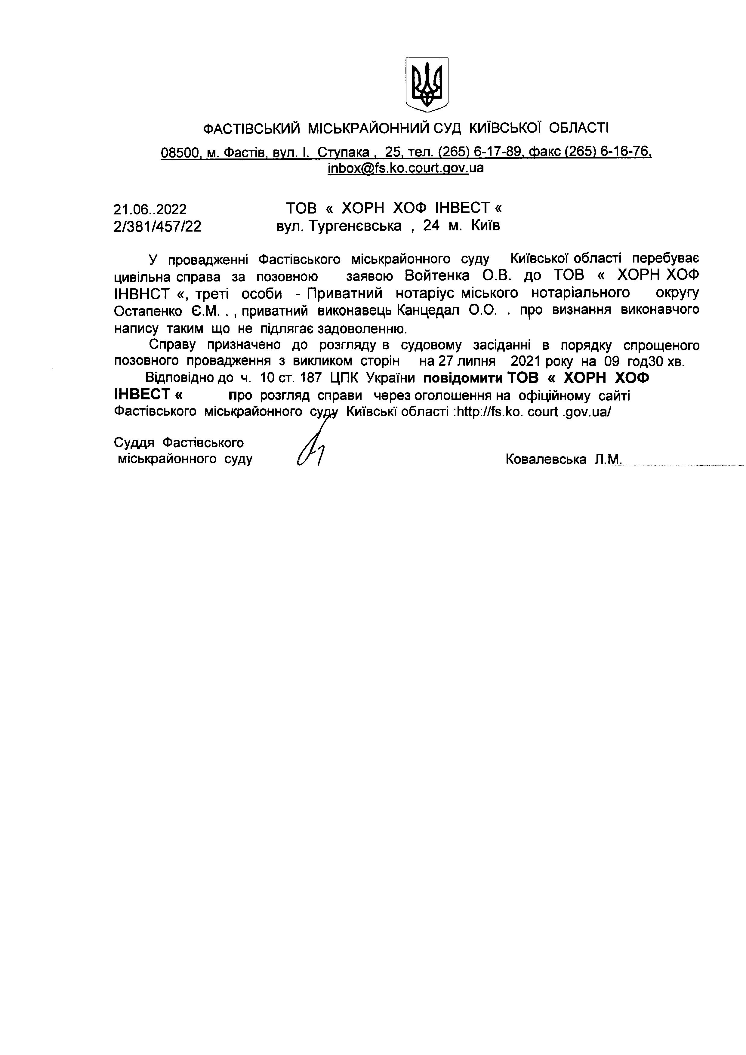ТОВ « ХОРН ХОФ ІНВЕСТ «