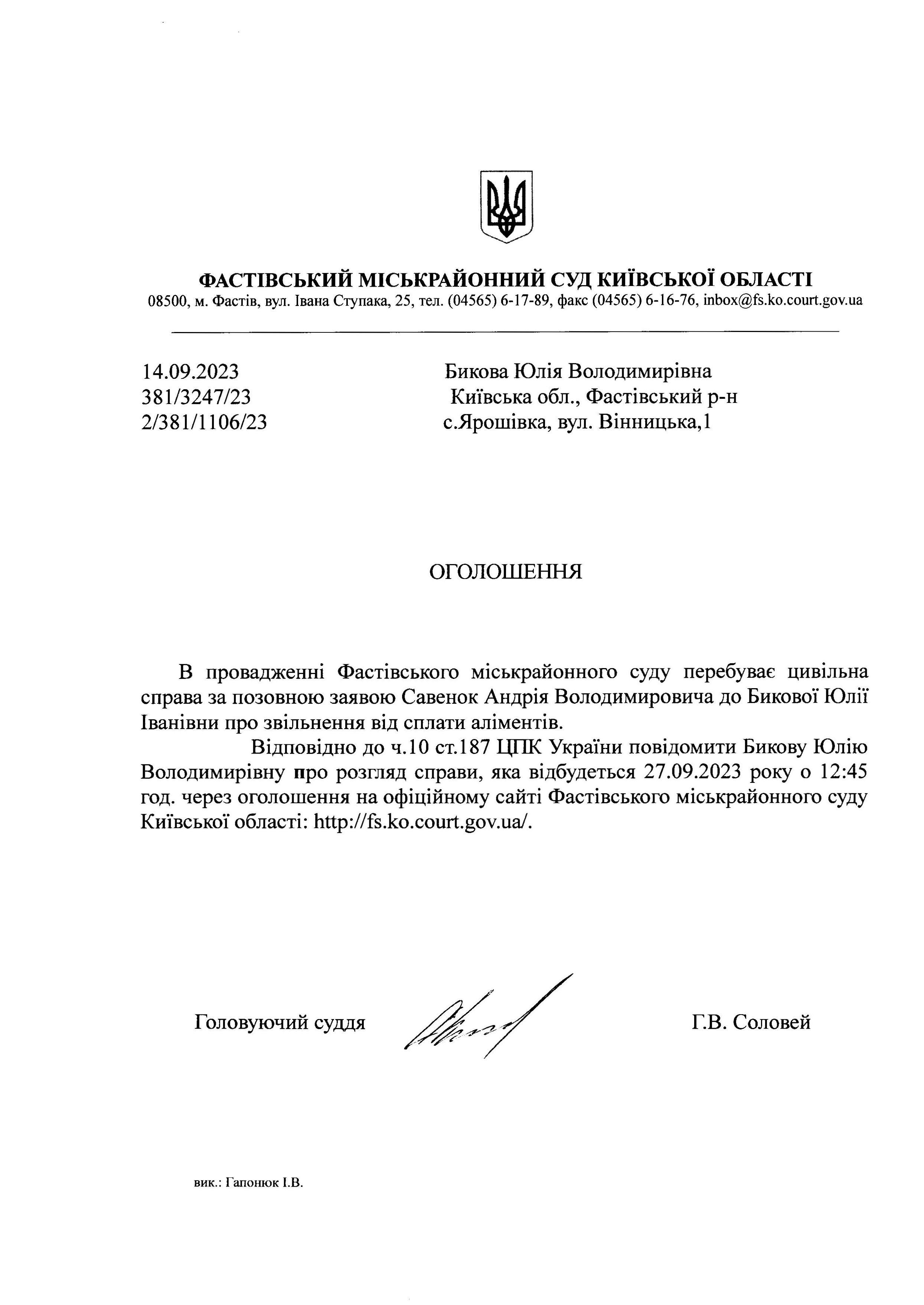 Бикова Юлія Володимирівна Київська обл., Фастівський р-н с.Ярошівка, вул. Вінницька,!