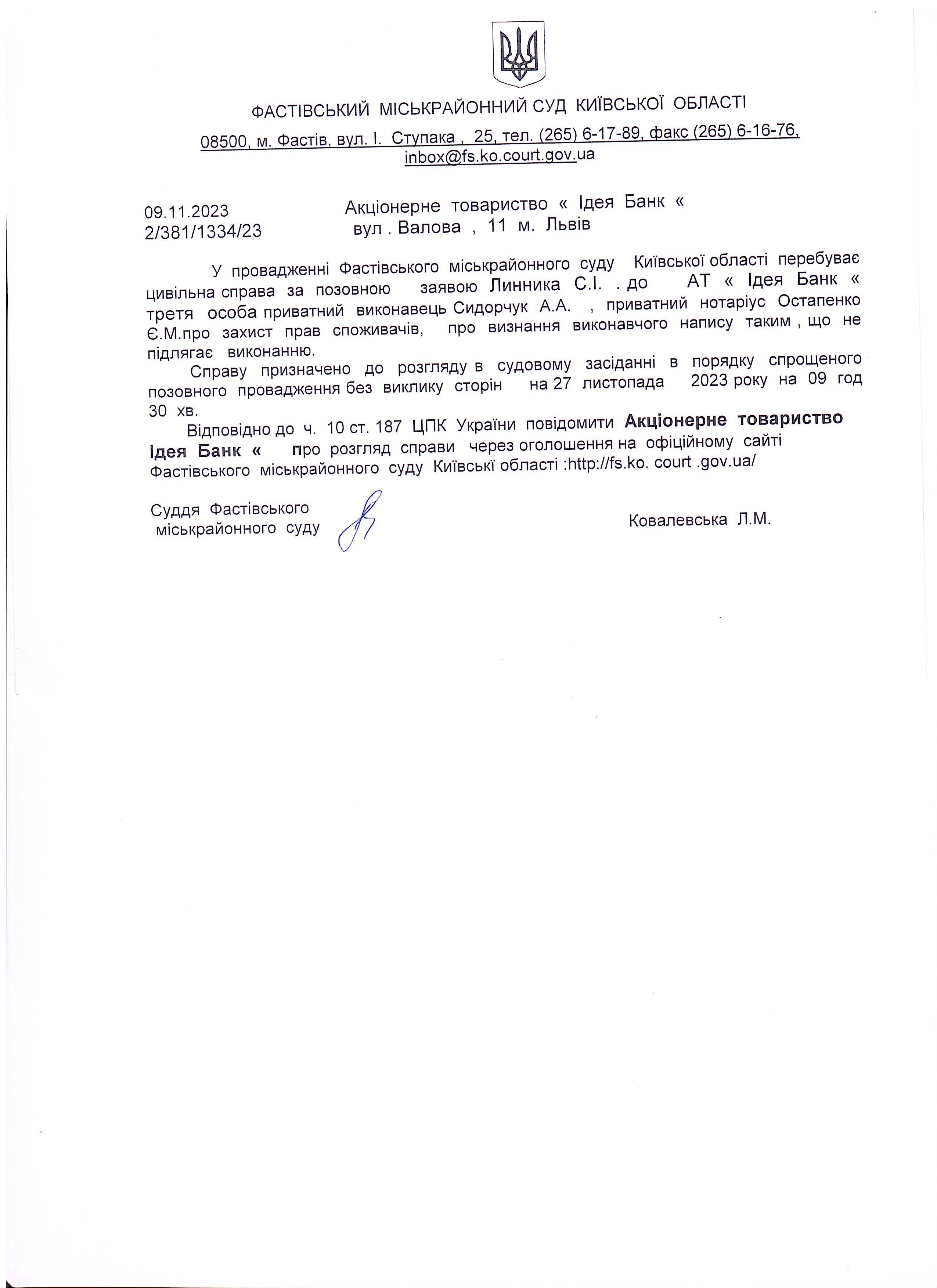 Акціонерне товариство « Ідея Банк « 2/381/1334/23 вул . Валова , 11 м. Львів