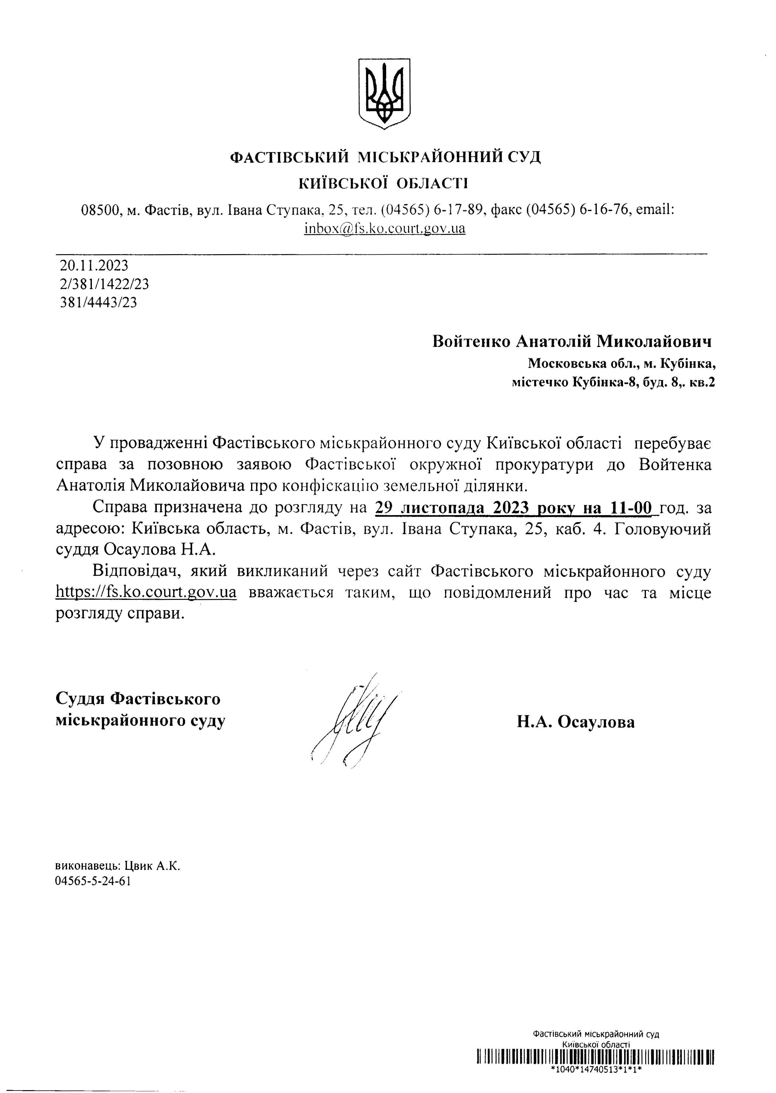 Войтенко Анатолій Миколайович Московська обл., м. Кубінка, містечко Кубінка-8, буд. 8,. кв.2