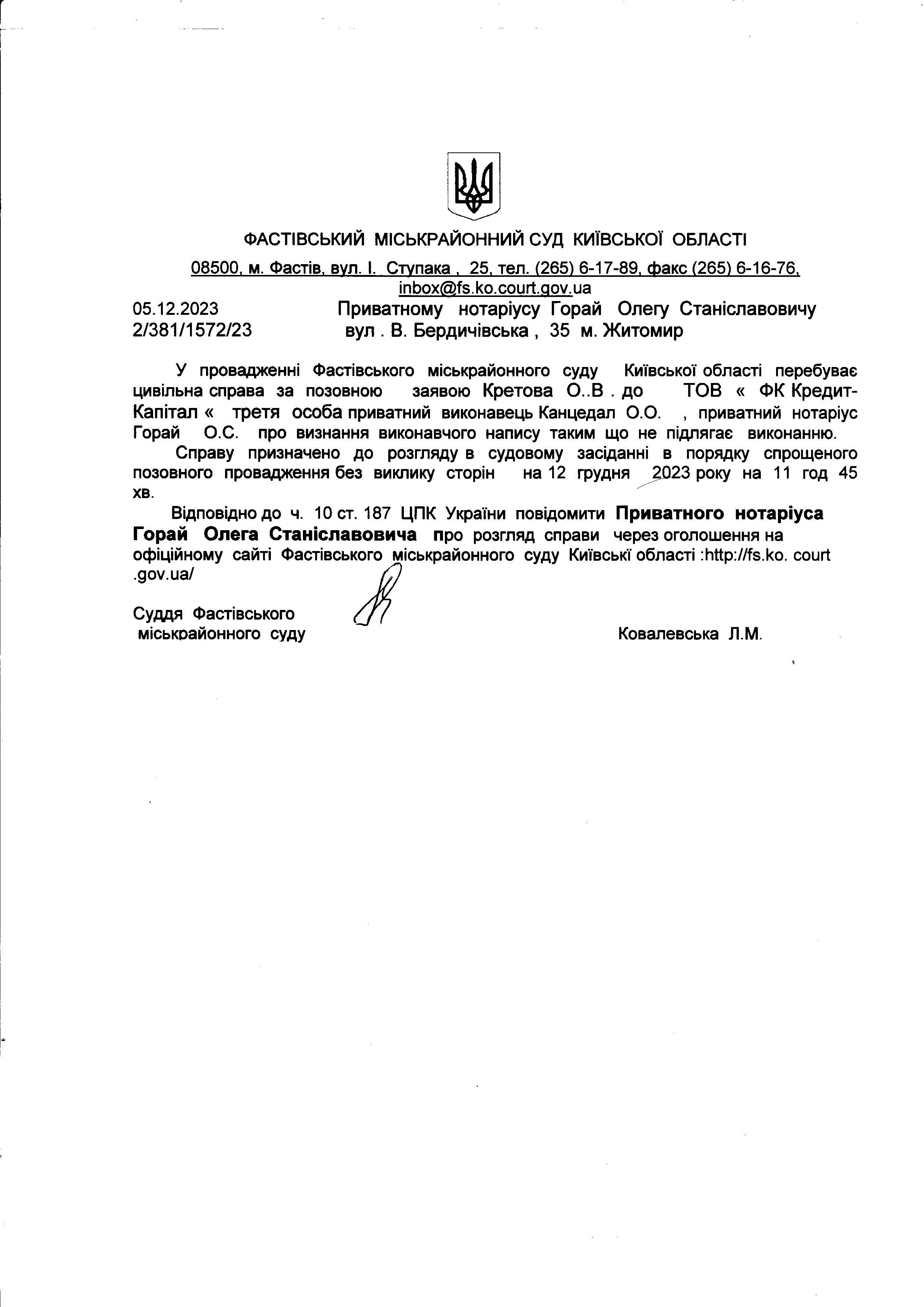 риватному нотаріусу Горай Олегу Станіславовичу 2/381/1572/23 вул . В. Бердичівська , 35 м. Житомир