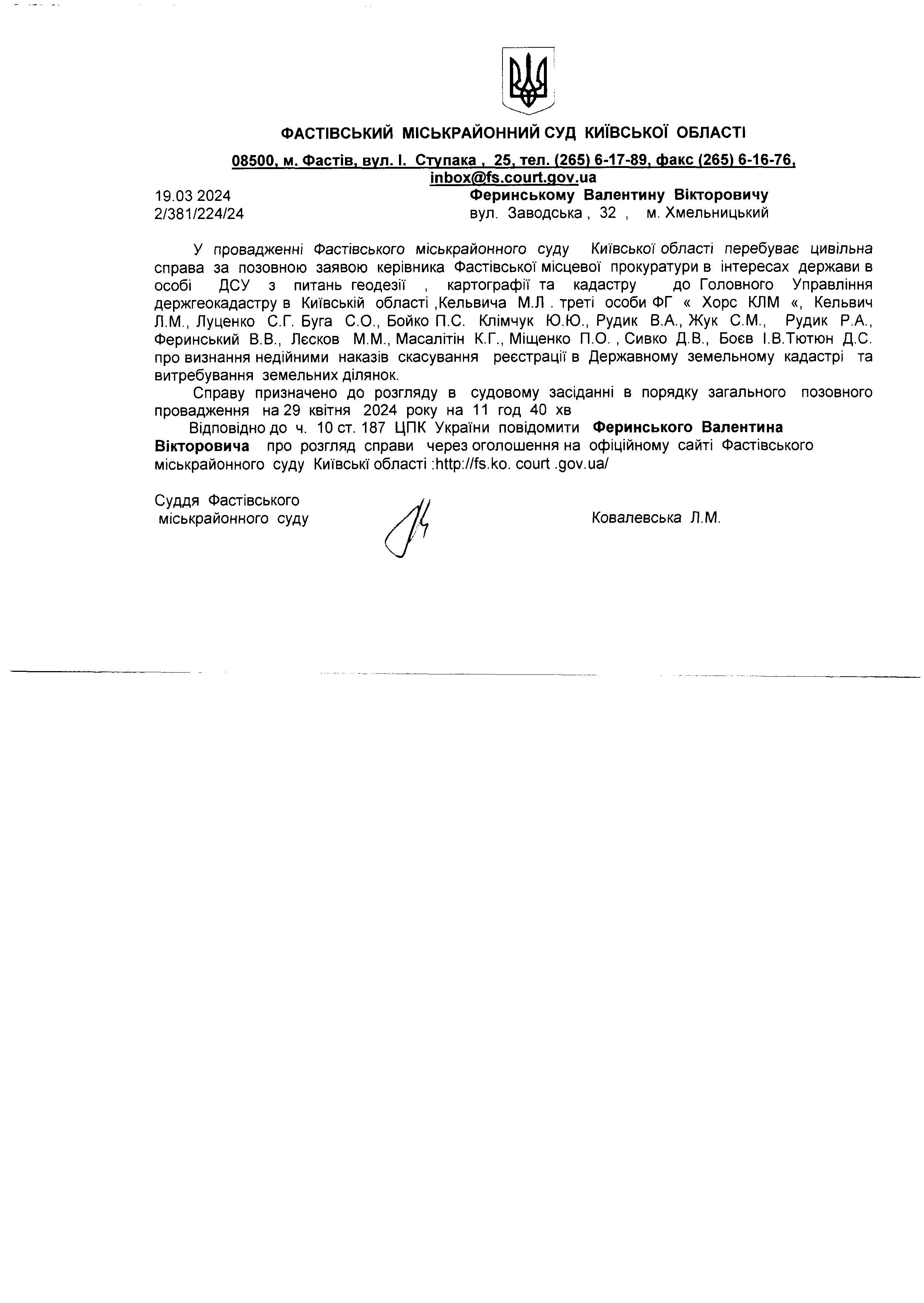 Феринському Валентину Вікторовичу 2/381/224/24 вул. Заводська , 32 , м. Хмельницький