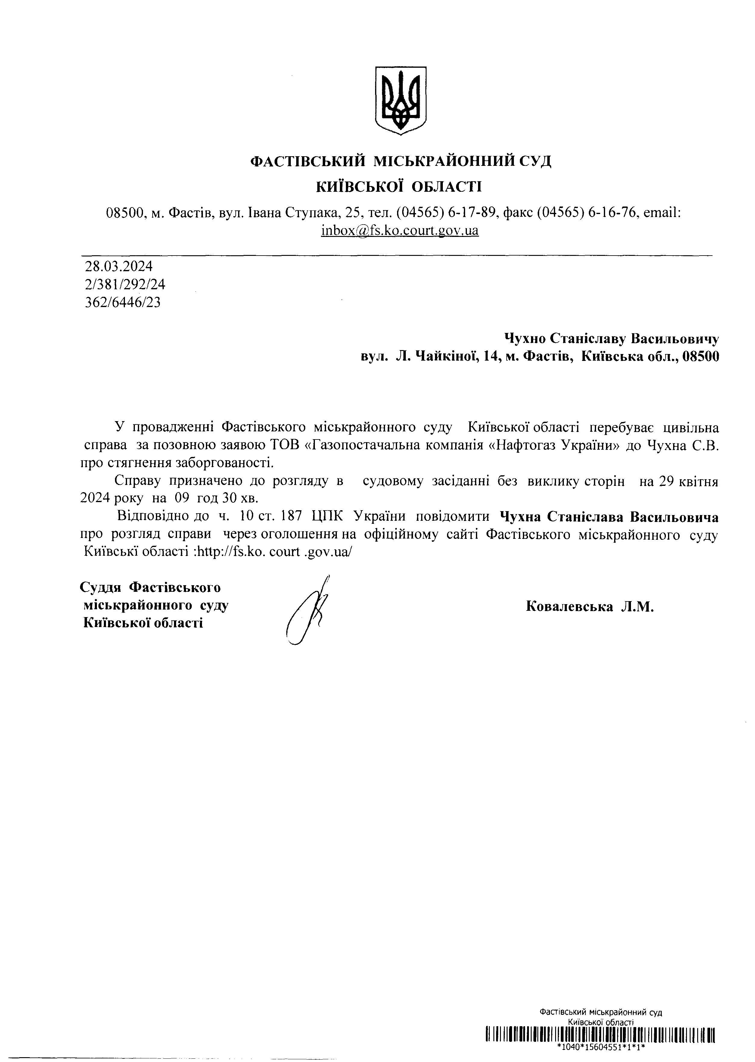 Чухно Станіславу Васильовичу вул. Л. Чайкіної, 14, м. Фастів, Київська обл., 08500