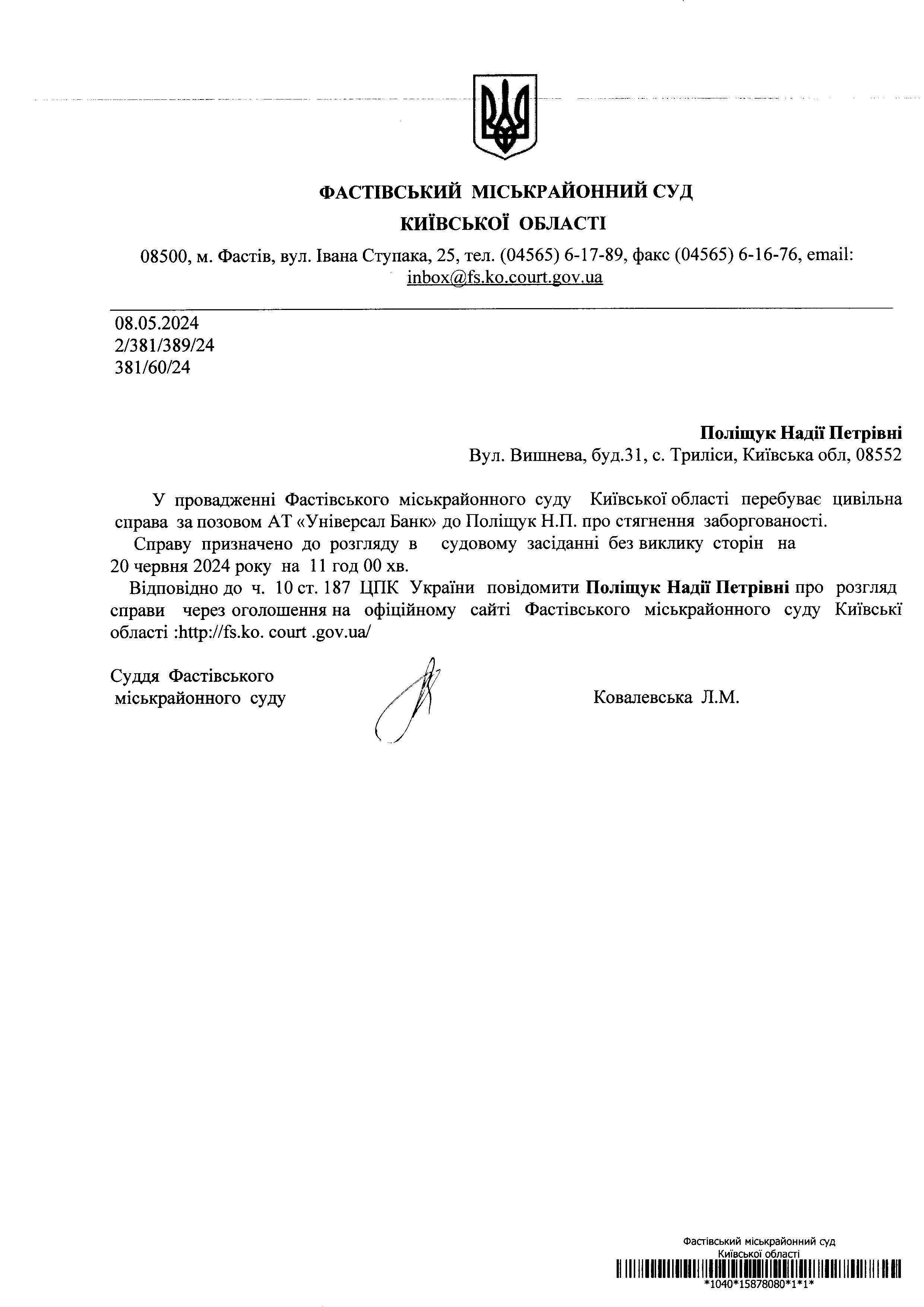 Поліщук Надії Петрівні Вул. Вишнева, буд.31, с. Триліси, Київська обл, 08552