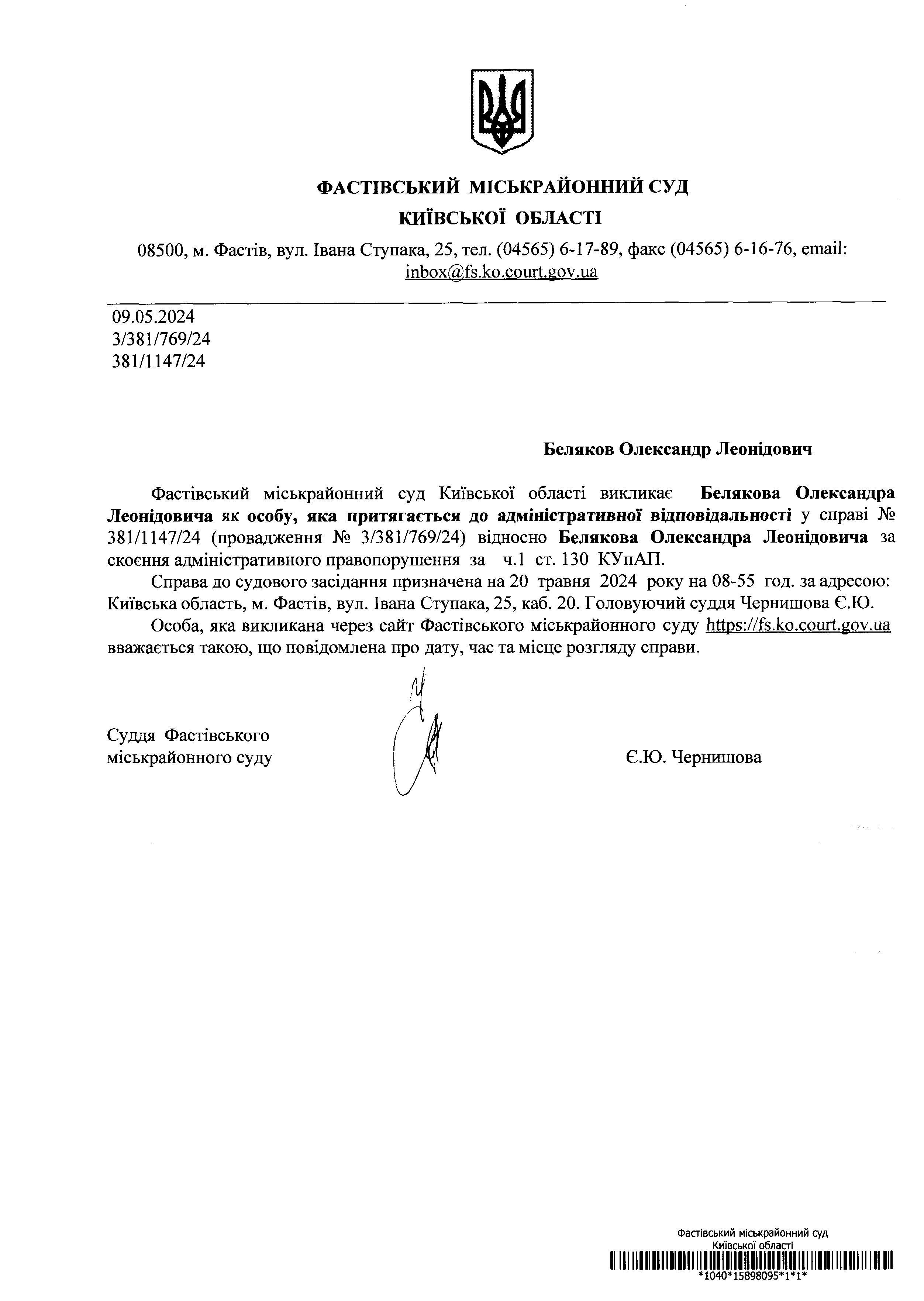 викликає Боярчук Вікторію Олександрівну як особу, яка притягається до адміністративної відповідальності у справі № 381/1409/24