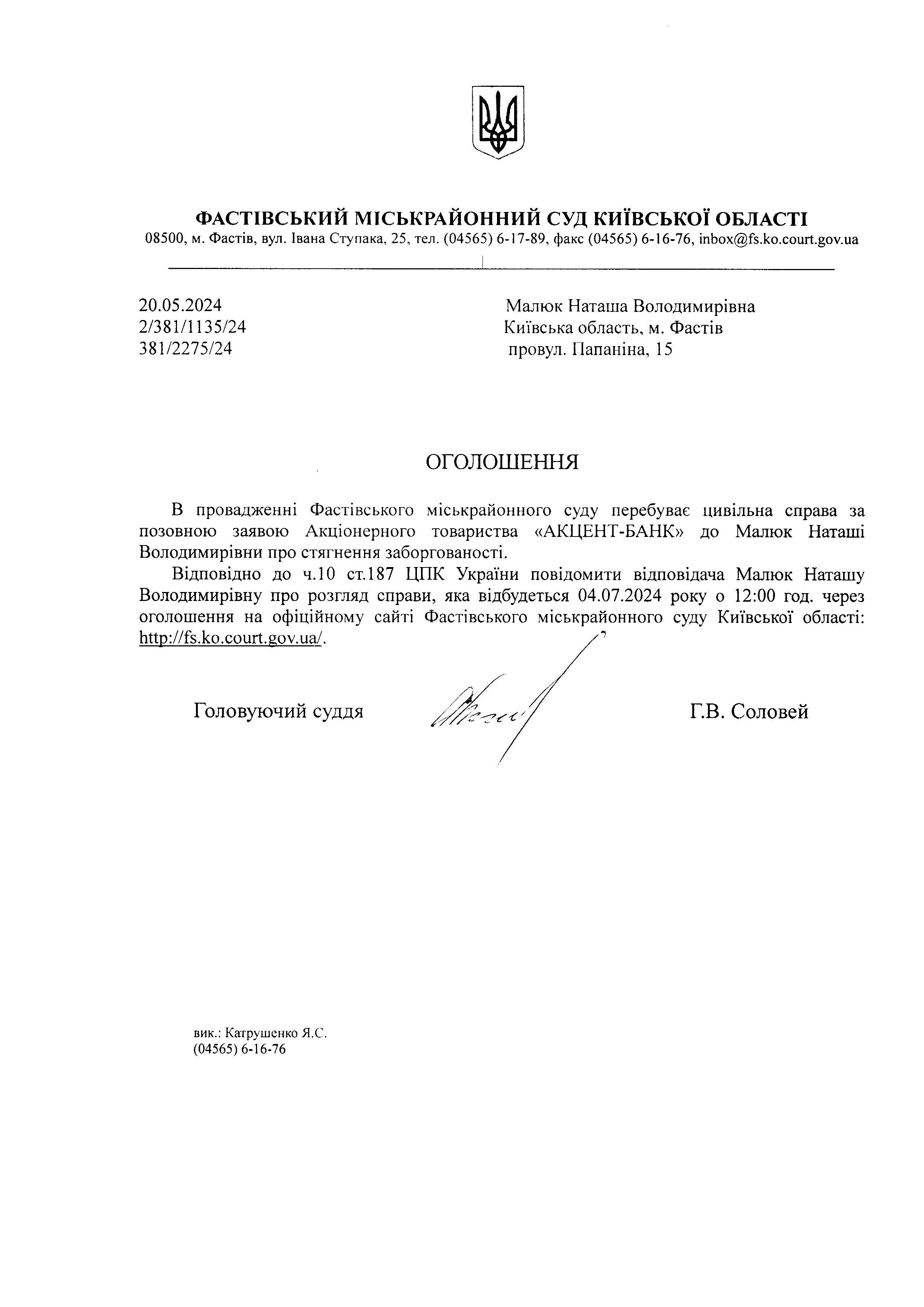 Малюк Наташа Володимирівна Київська область, м. Фастів провул. Папаніна, 15