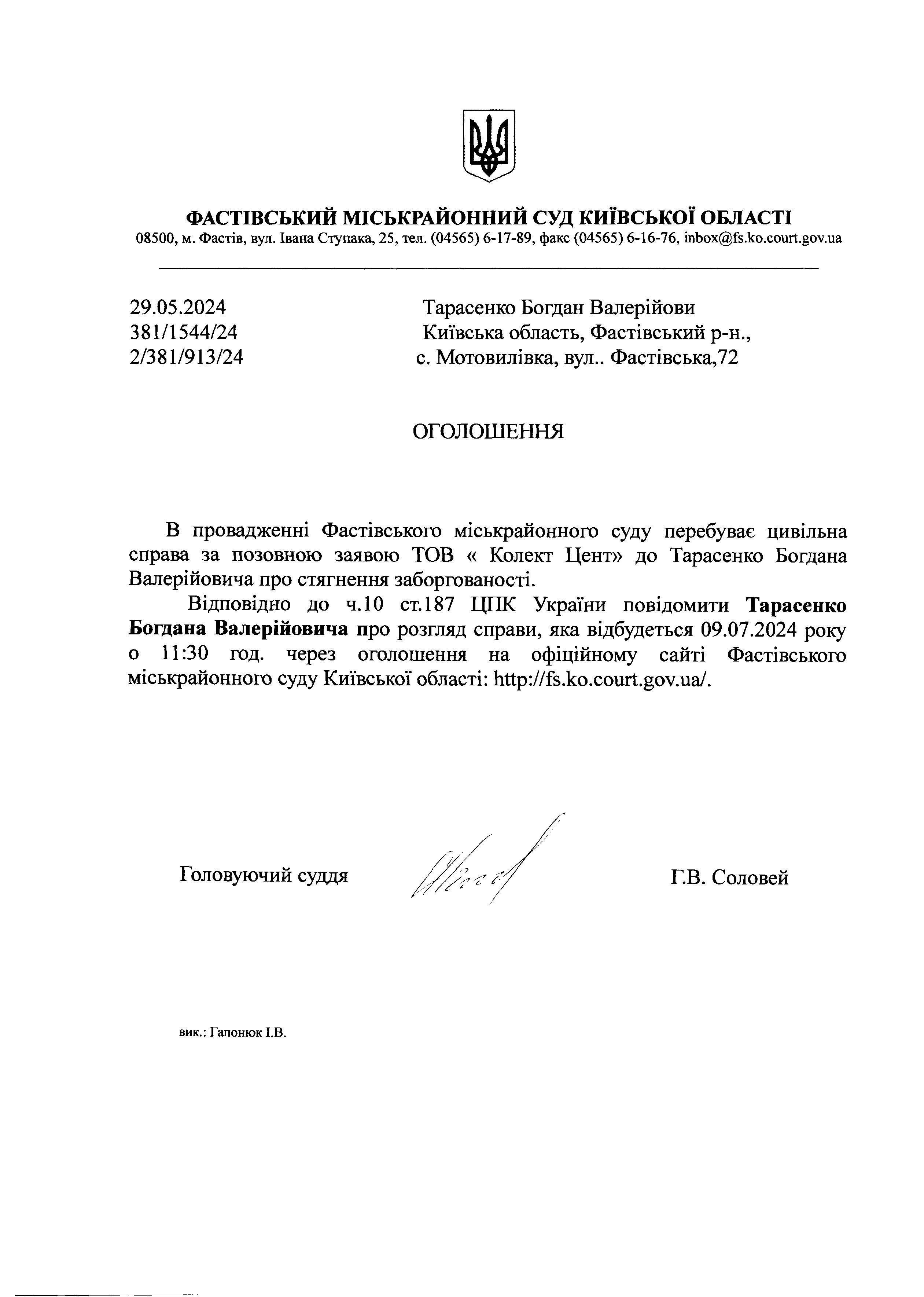 Тарасенко Богдан Валерійови Київська область, Фастівський р-н., с. Мотовилівка, вул.. Фастівська,72
