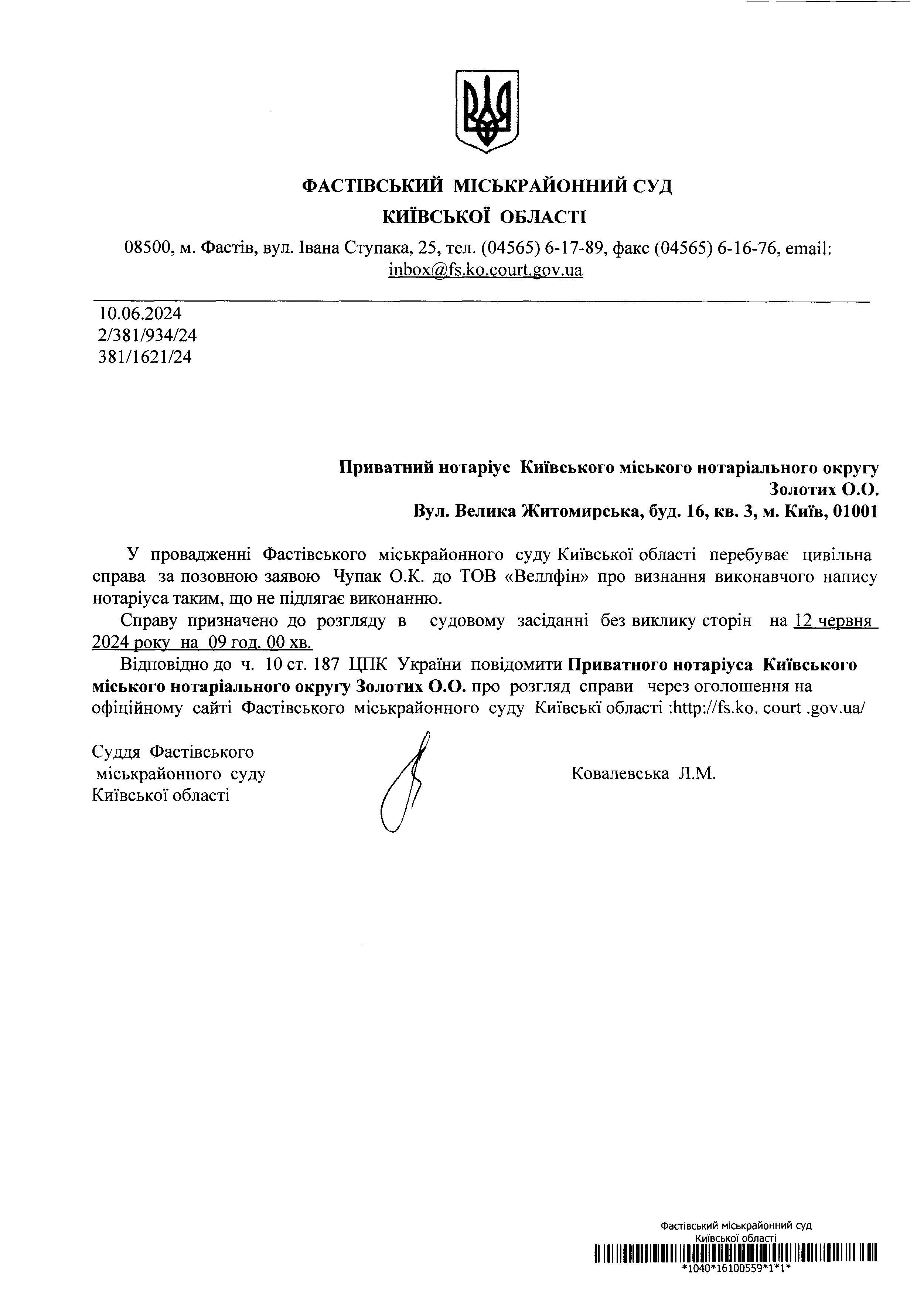 Приватний нотаріус Київського міського нотаріального округу Золотих 0.0. Вул. Велика Житомирська, буд. 16, кв. З, м. Київ, 01001