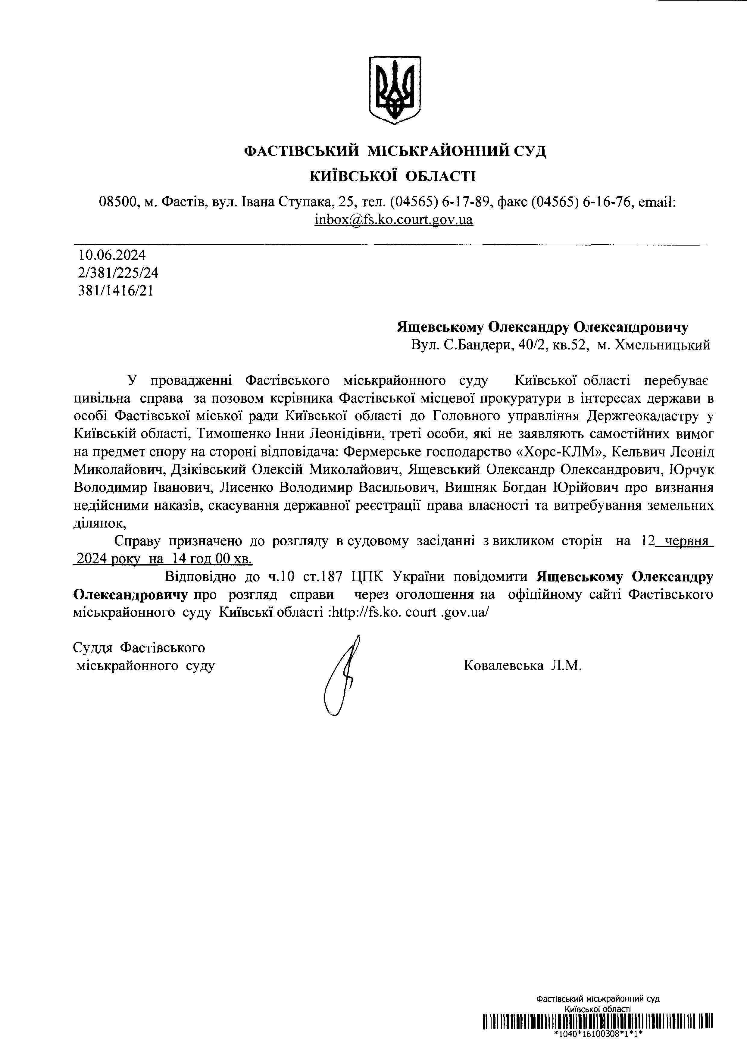 Ящевському Олександру Олександровичу Вул. С.Бандери, 40/2, кв.52, м. Хмельницький