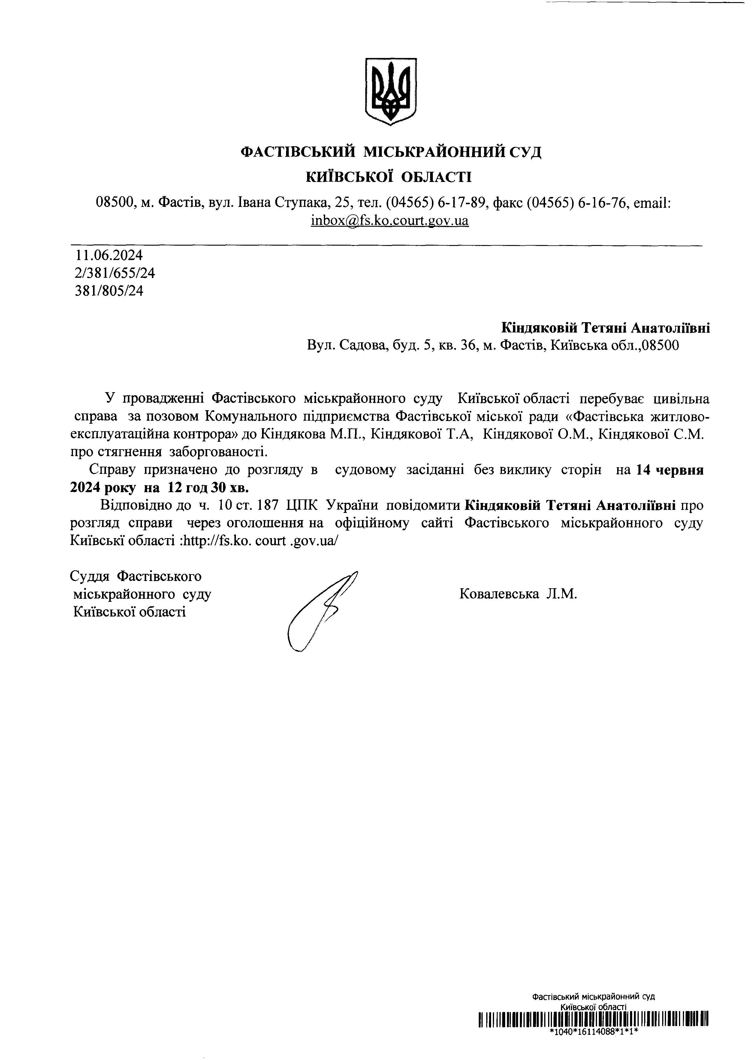 Кіндяковій Тетяні Анатоліївні Вул. Садова, буд. 5, кв. 36, м. Фастів, Київська обл.,08500