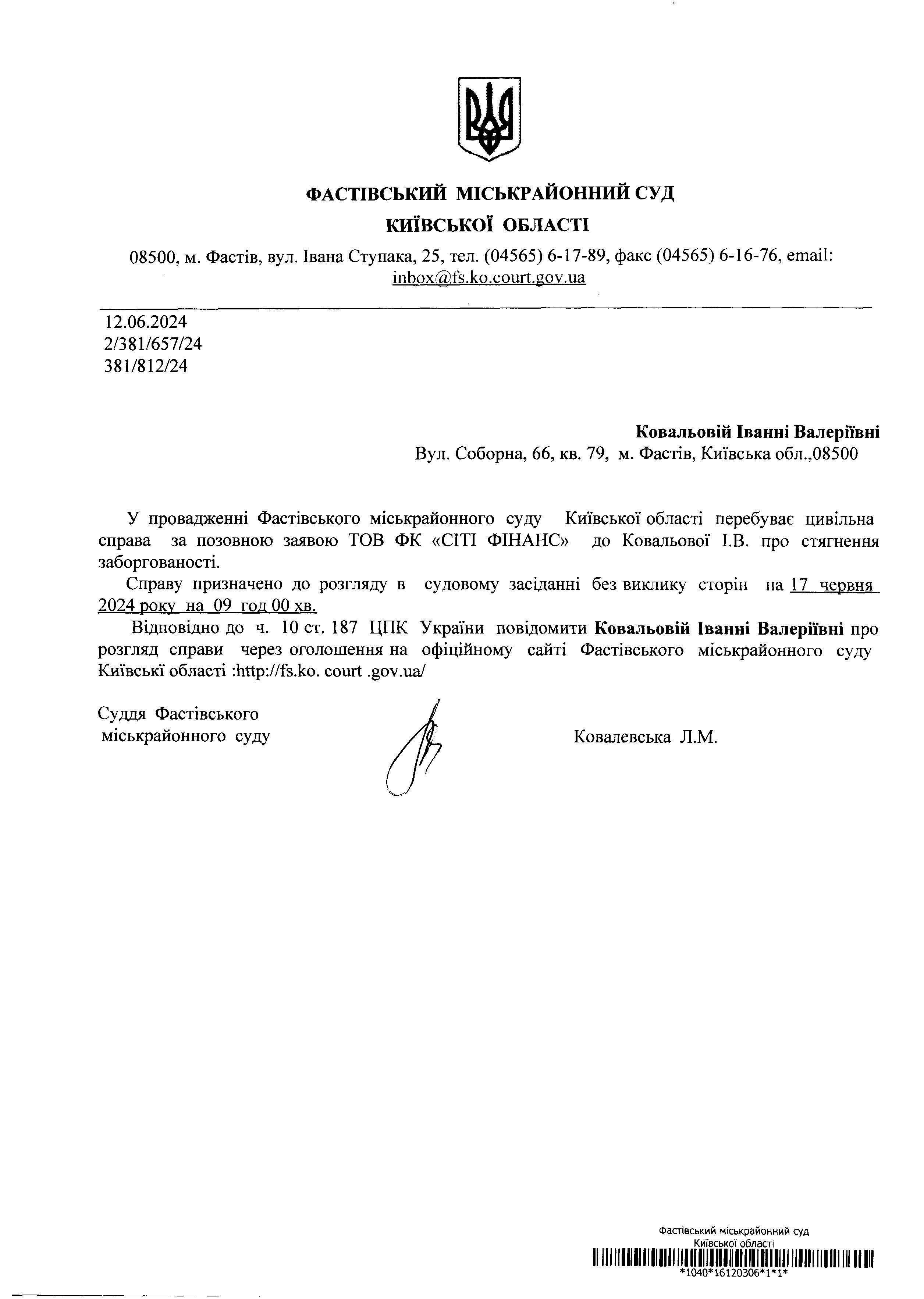 Круківській Світлані Анатоліївна Вул. Миколи Малащука, буд. 40, кв. 32-1, 32-2, м. Фастів, Київська обл.,08500