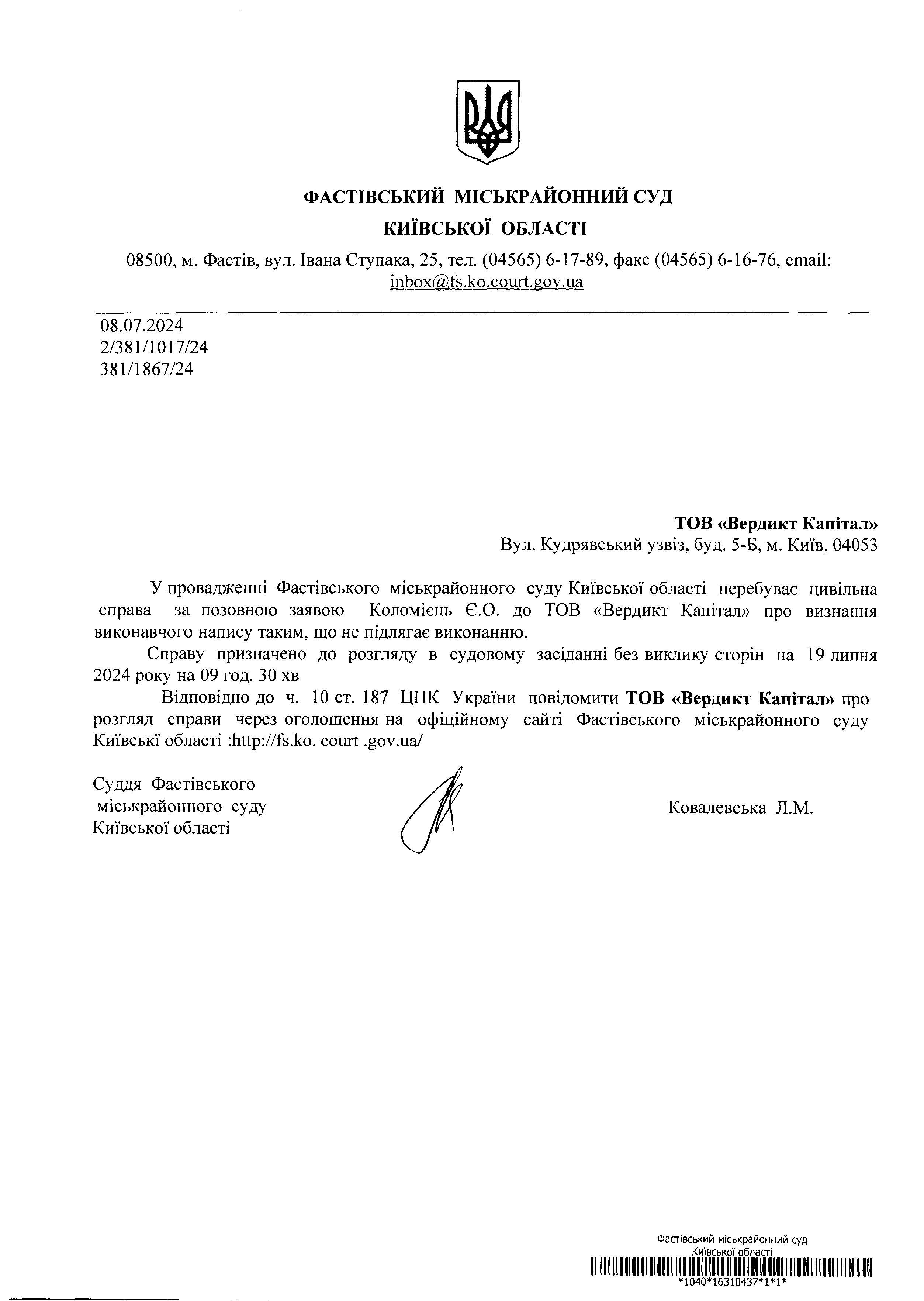 TOB «Вердикт Капітал» Вул. Кудрявський узвіз, буд. 5-Б, м. Київ, 04053