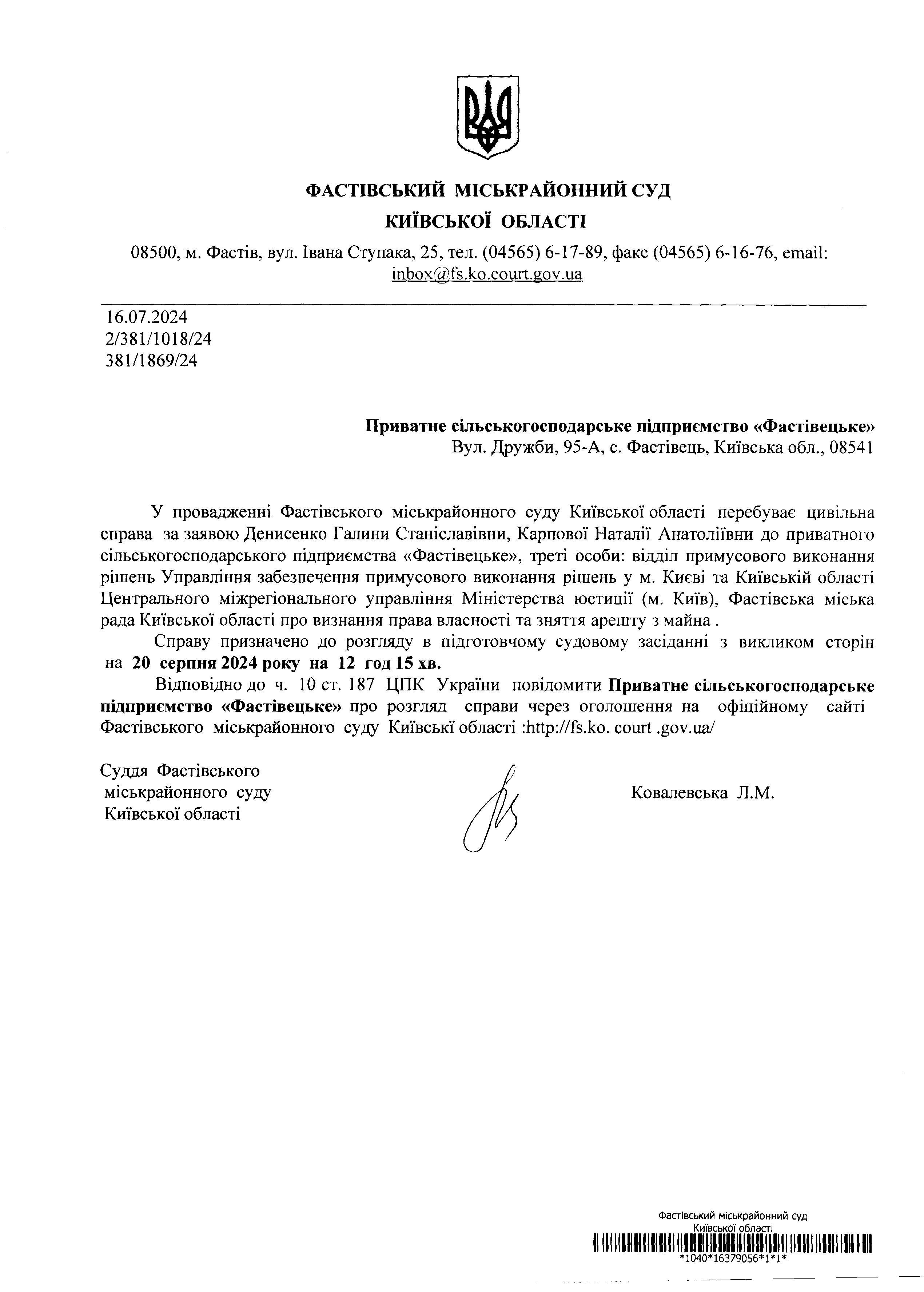 Приватне сільськогосподарське підприємство «Фастівецьке» Вул. Дружби, 95-А, с. Фастівець, Київська обл., 08541