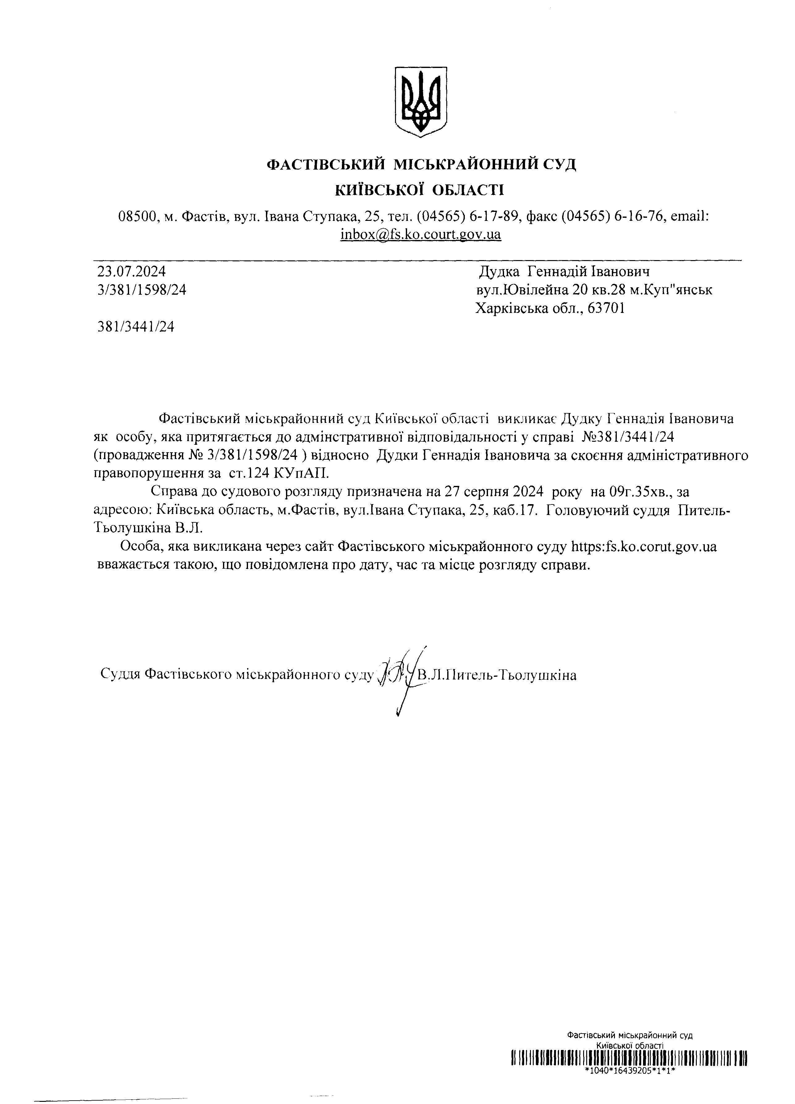 Дудка Геннадій Іванович вул.Ювілейна 20 кв.28 м.Куп"янськ Харківська обл., 63701