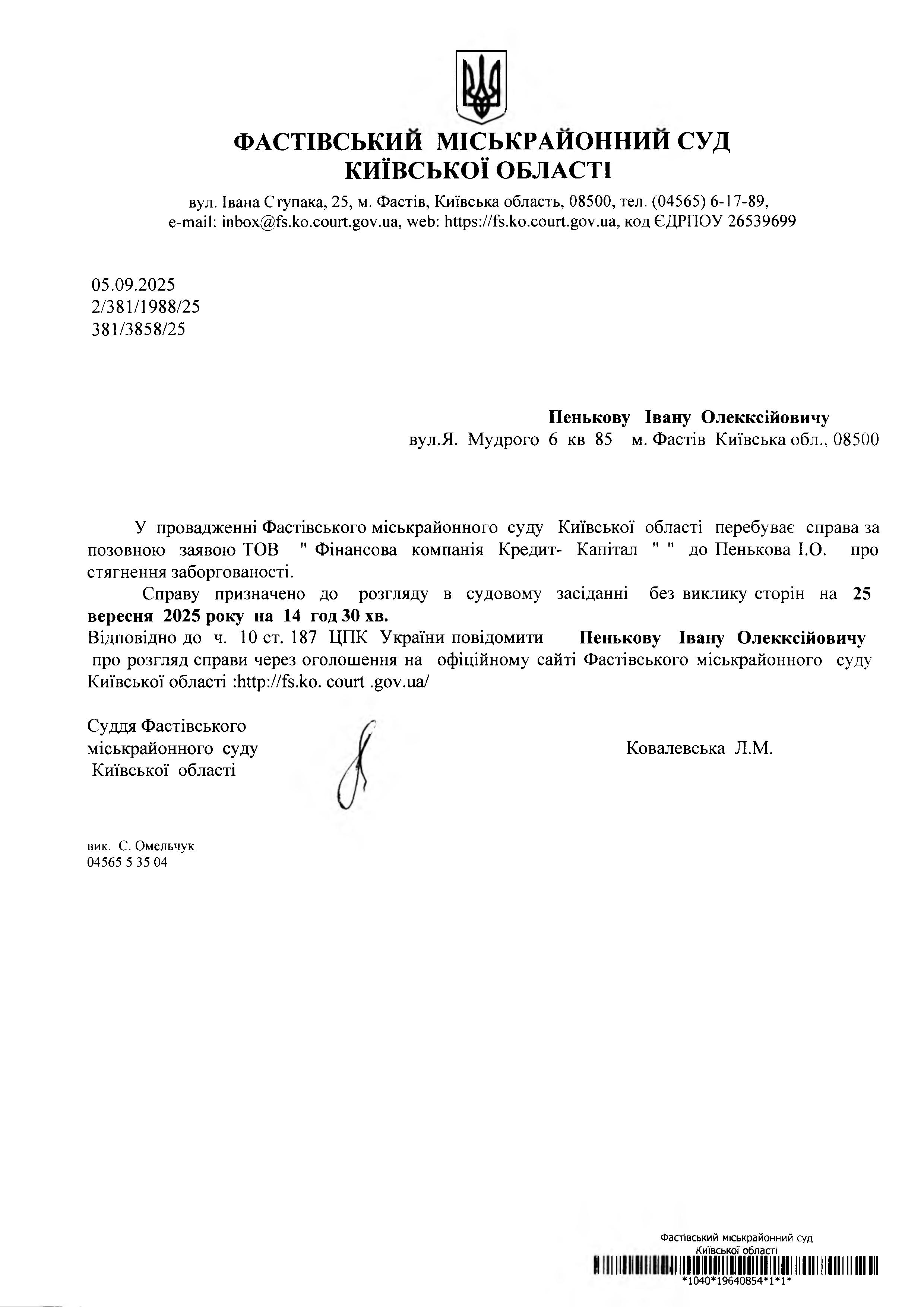 Пенькову Івану Олекксійовичу вул.Я. Мудрого 6 кв 85 м. Фастів Київська обл., 08500