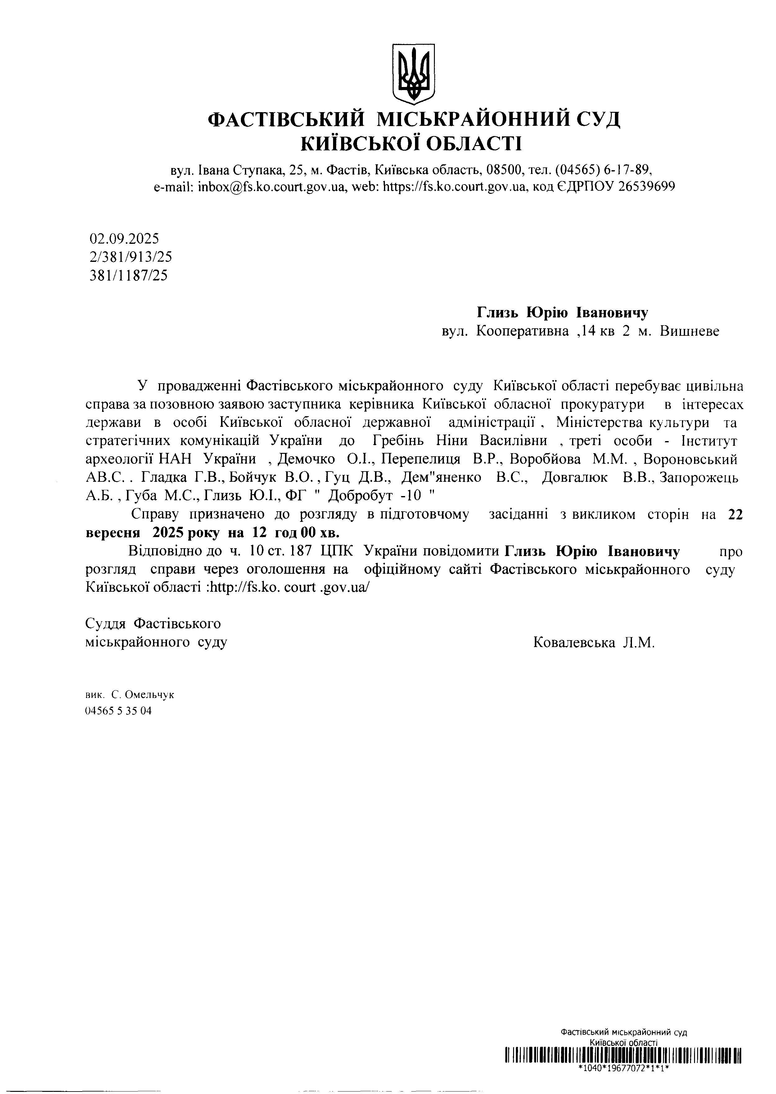 Глизь Юрію Івановичу вул. Кооперативна ,14 кв 2 м. Вишневе