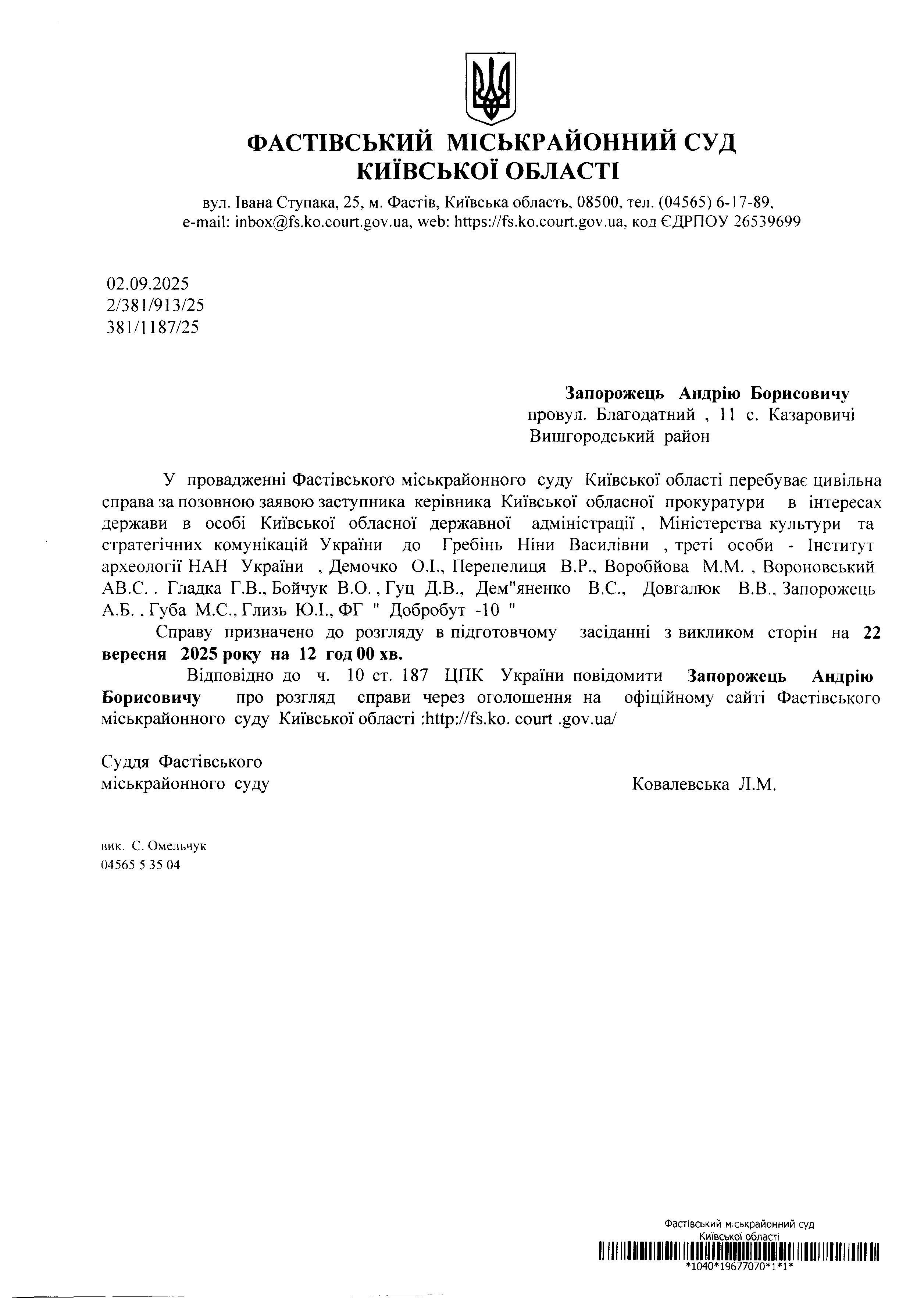 Запорожець Андрію Борисовичу провул. Благодатний , 11 с. Казаровичі Вишгородський район
