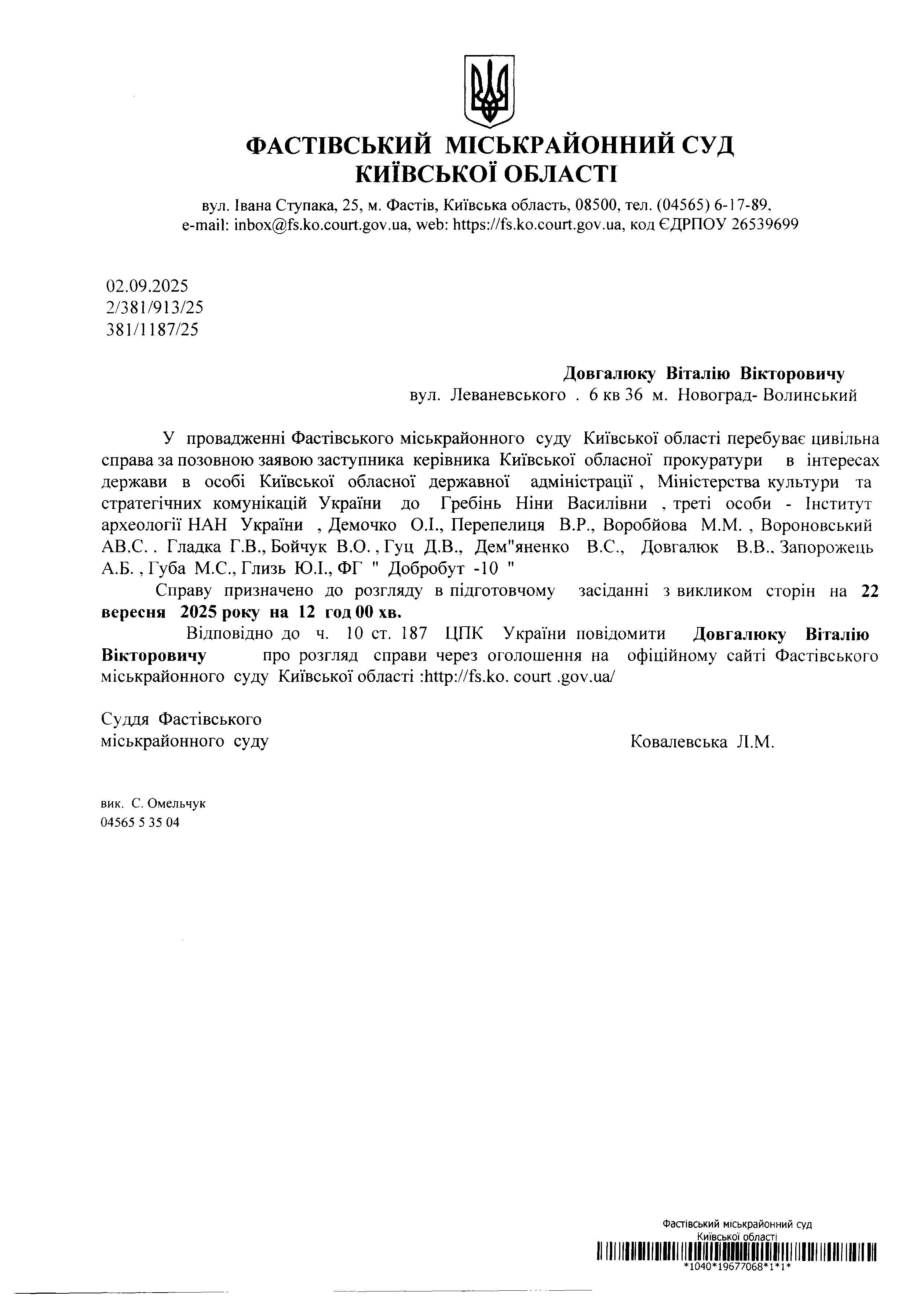 Довгалюку Віталію Вікторовичу вул. Леваневського . 6 кв 36 м. Новоград- Волинський