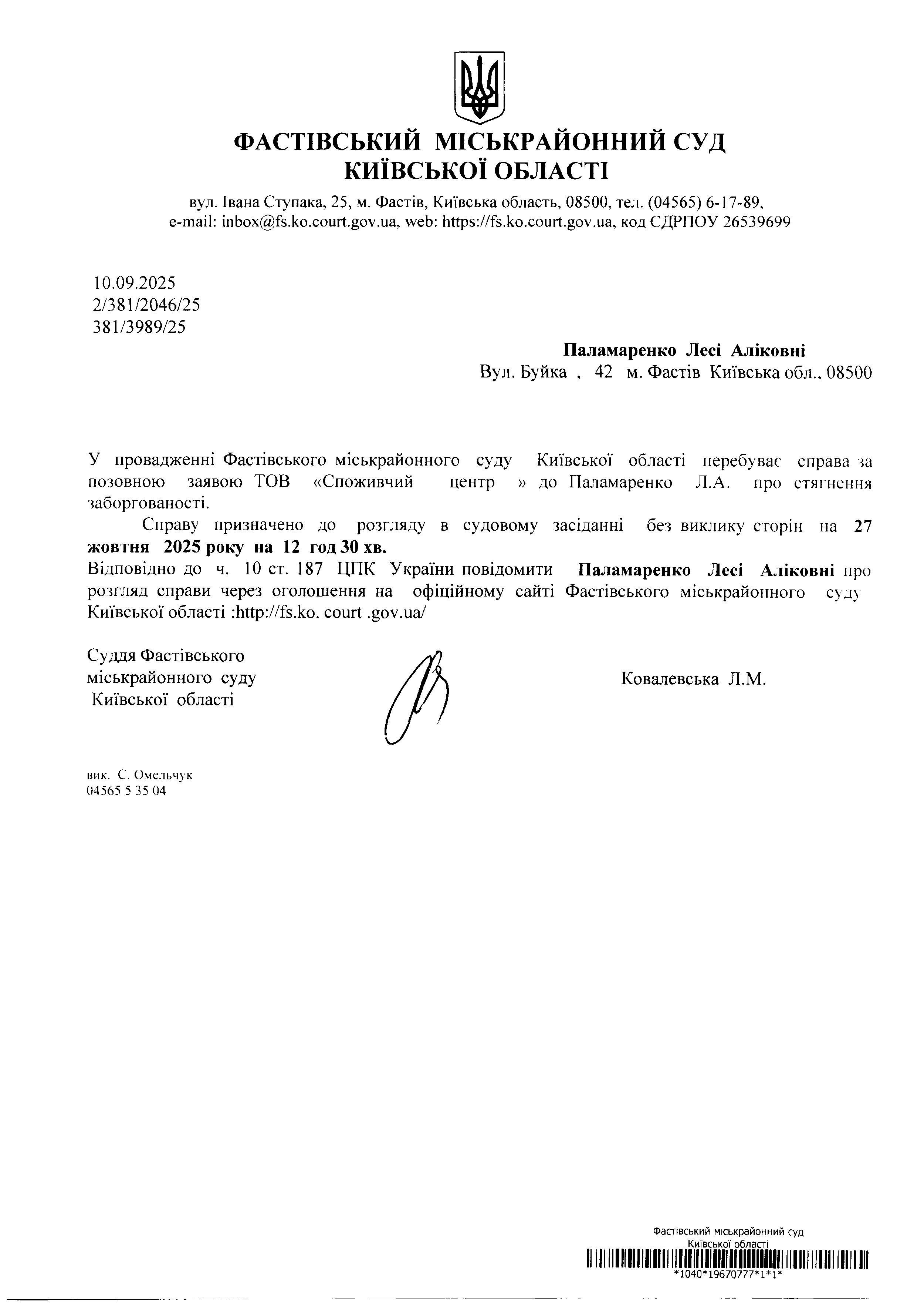 Паламаренко Лесі Аліковні Вул. Буйка , 42 м. Фастів Київська обл., 08500