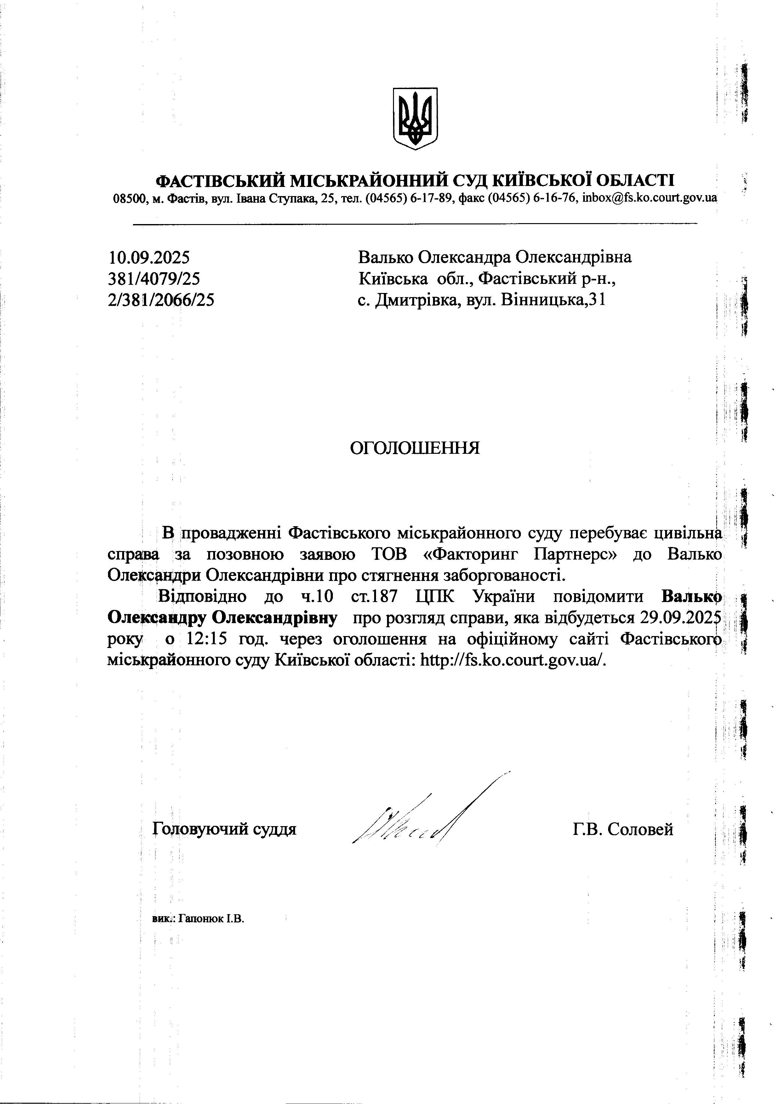 Валько Олександра Олександрівна Київська обл., Фастівський р-н., с. Дмитрівка, вул. Вінницька,31