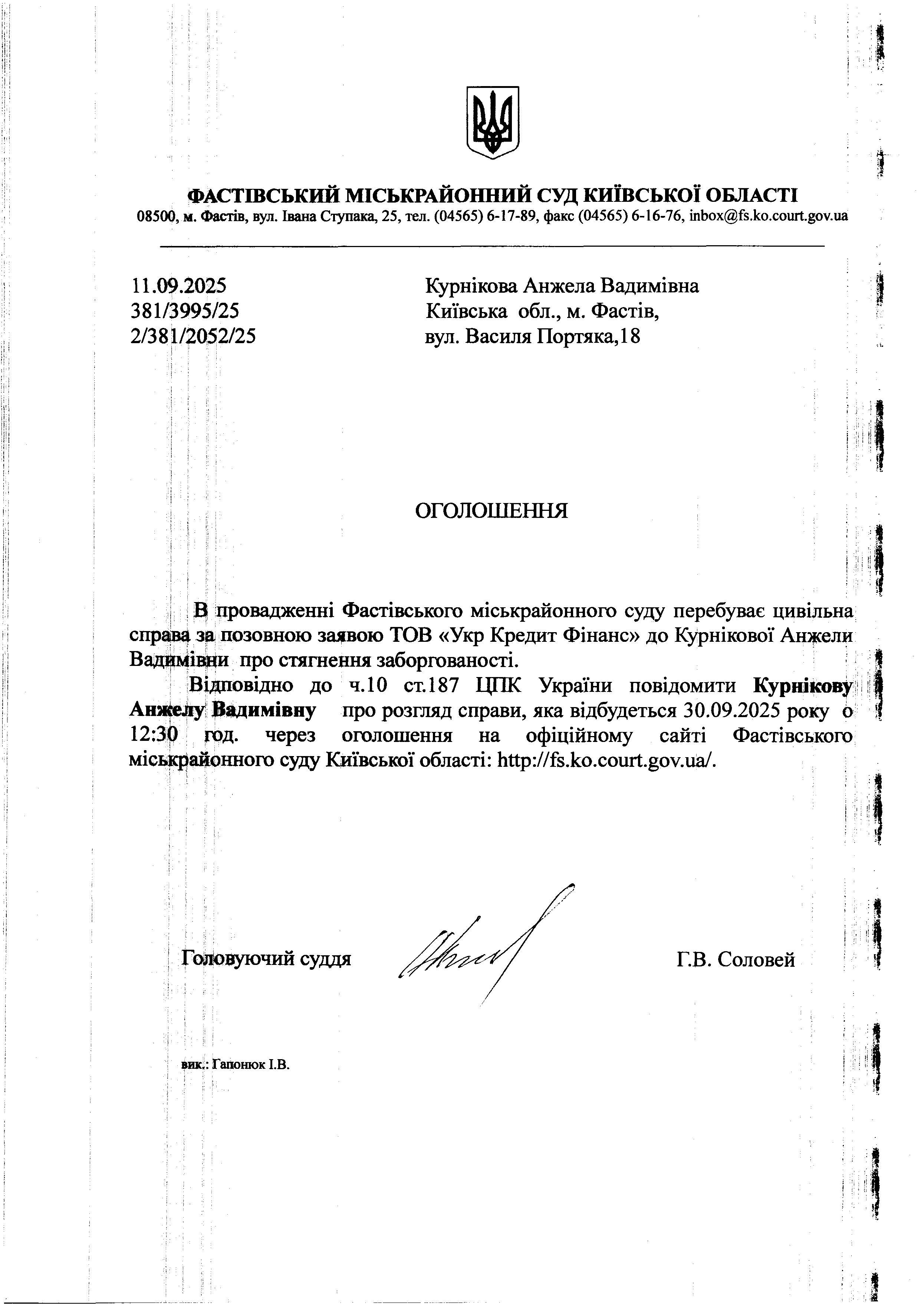Курнікова Анжела Вадимівна Київська обл., м. Фастів, вул. Василя Портяка,18
