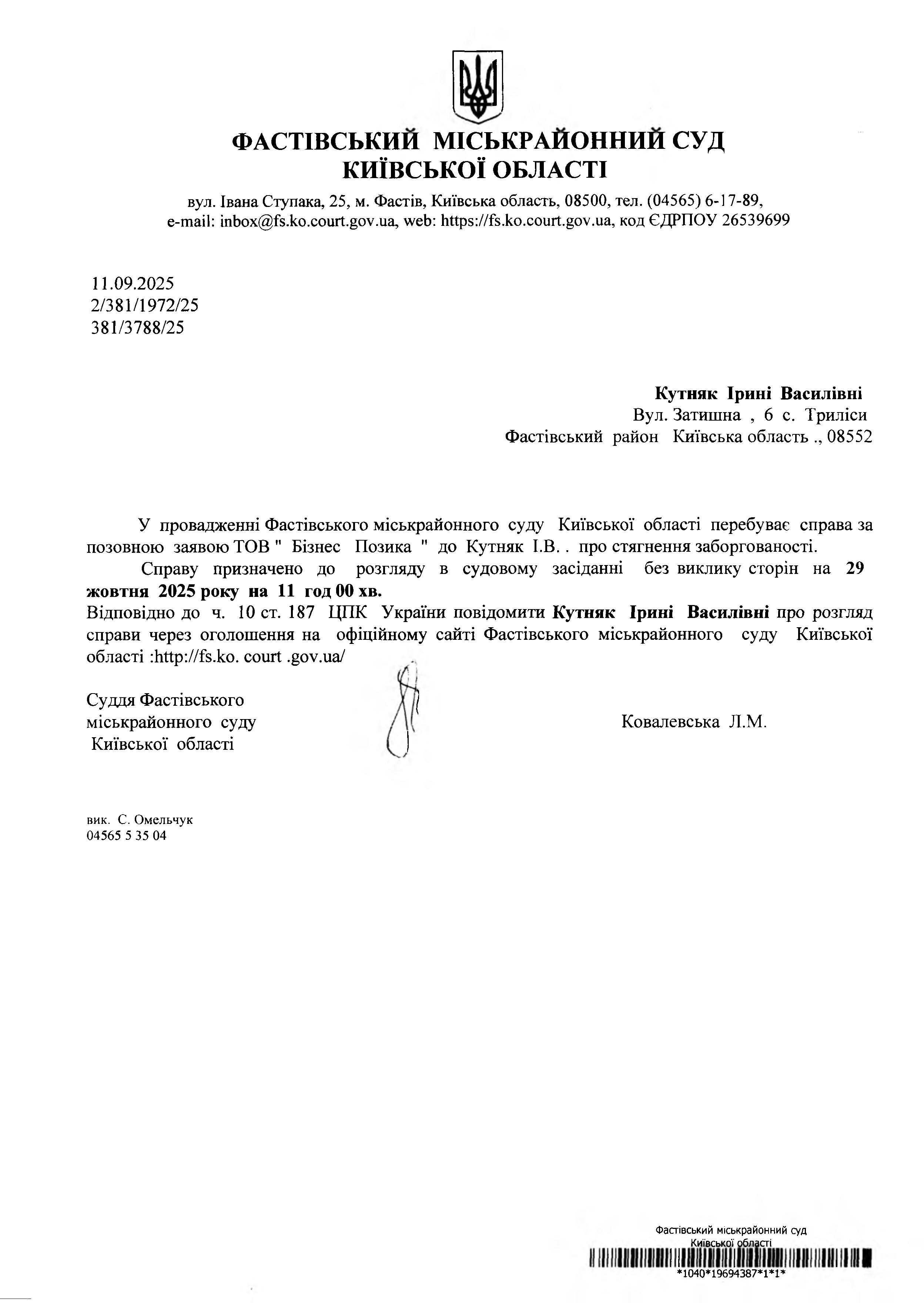 Кутняк Ірині Василівні Вул. Затишна ,6 с. Триліси Фастівський район Київська область ., 08552