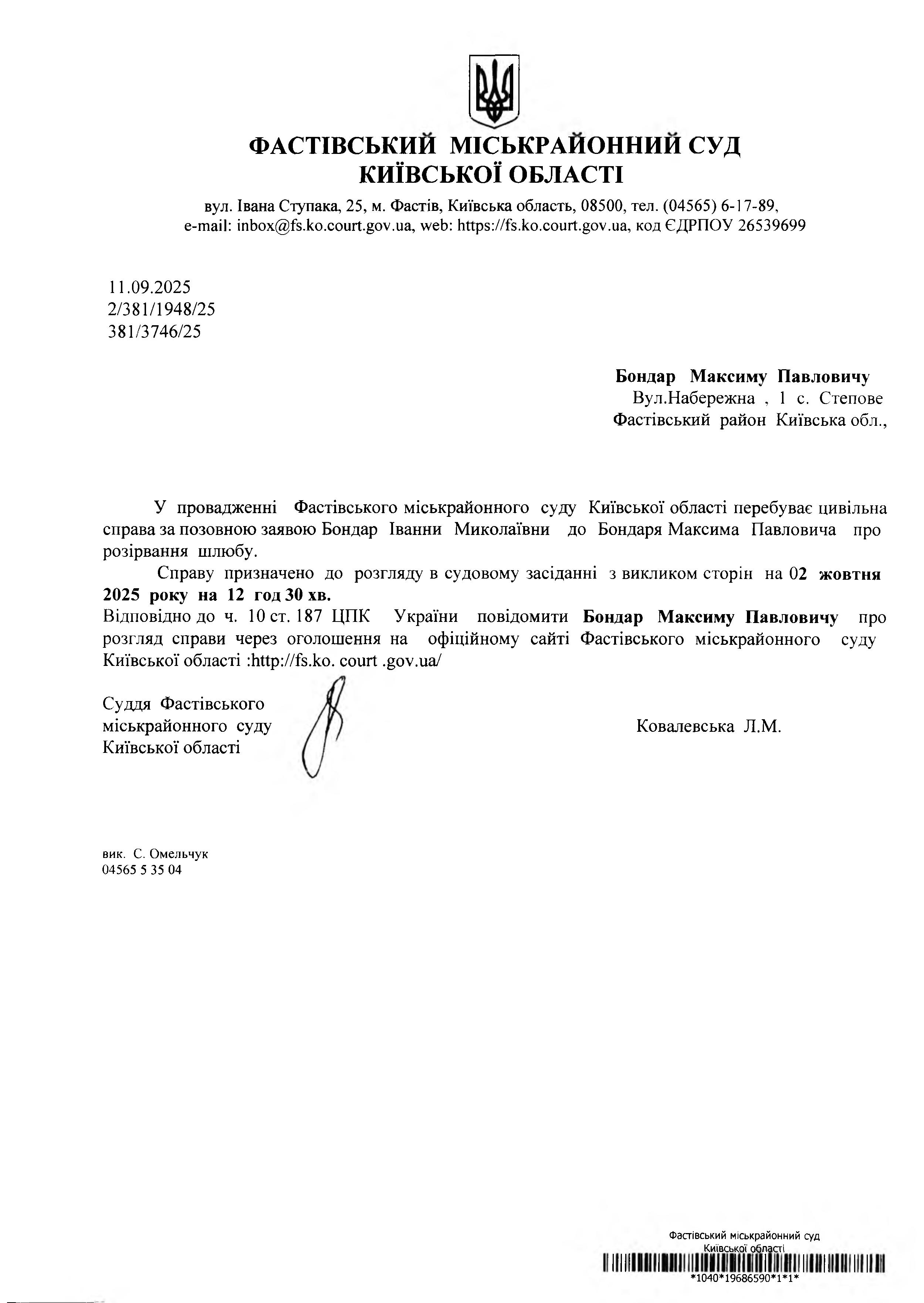Бондар Максиму Павловичу Вул.Набережна , 1 с. Степове Фастівський район Київська обл.,