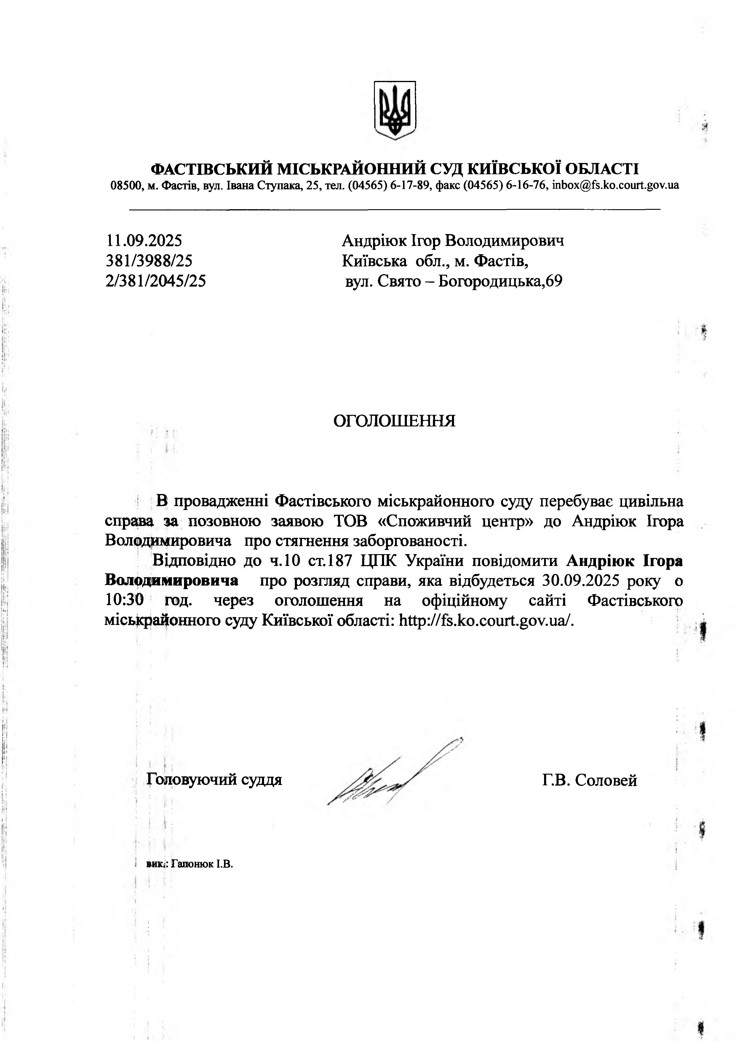 Андріюк Ігор Володимирович Київська обл., м. Фастів, вул. Свято - Богородицька,69