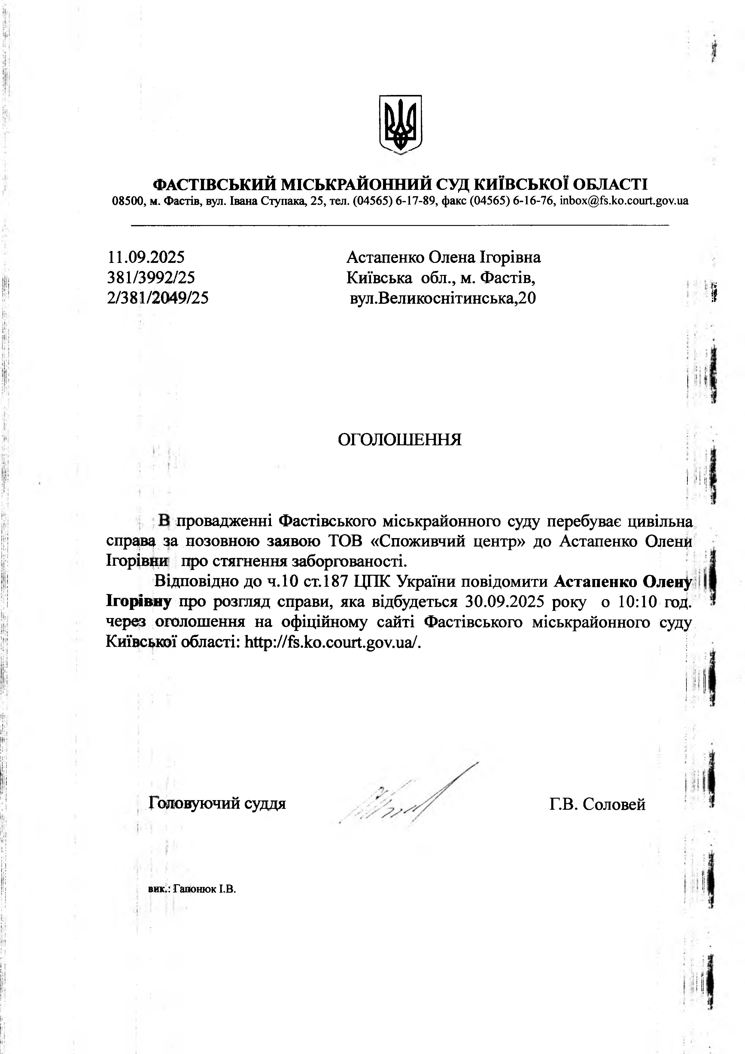 Астапенко Олена Ігорівна Київська обл., м. Фастів, вул.Великоснітинська,20