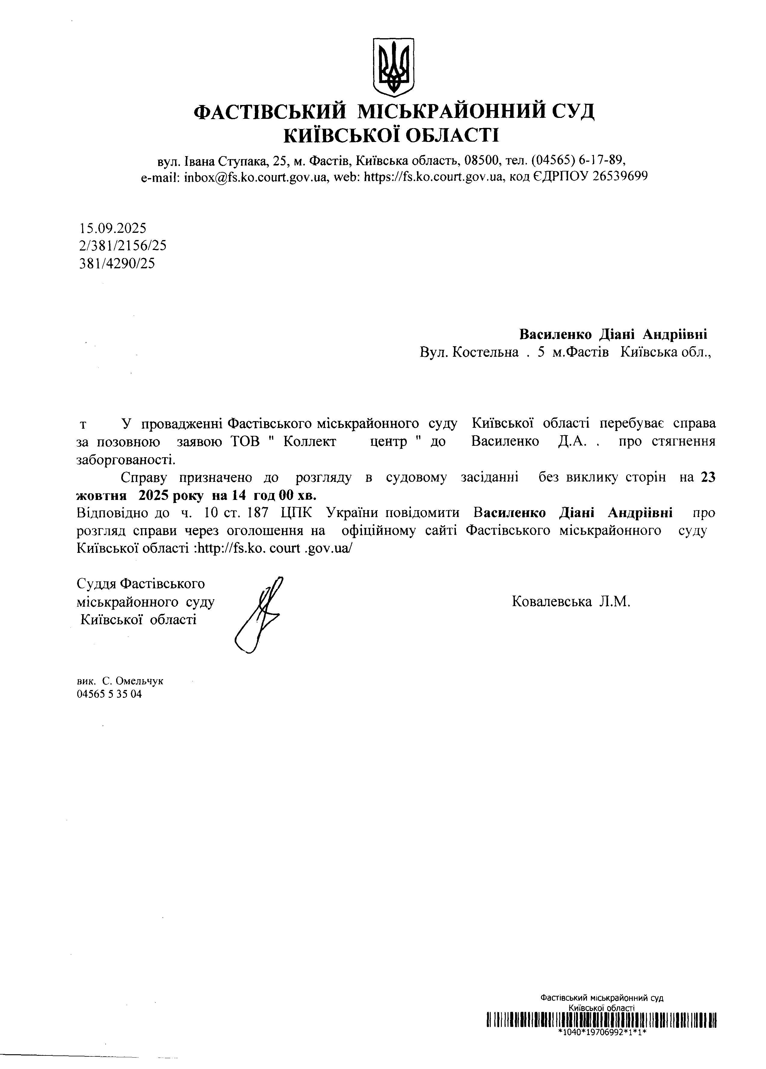 Василенко Діані Андріівні Вул. Костельна . 5 м.Фастів Київська обл.,
