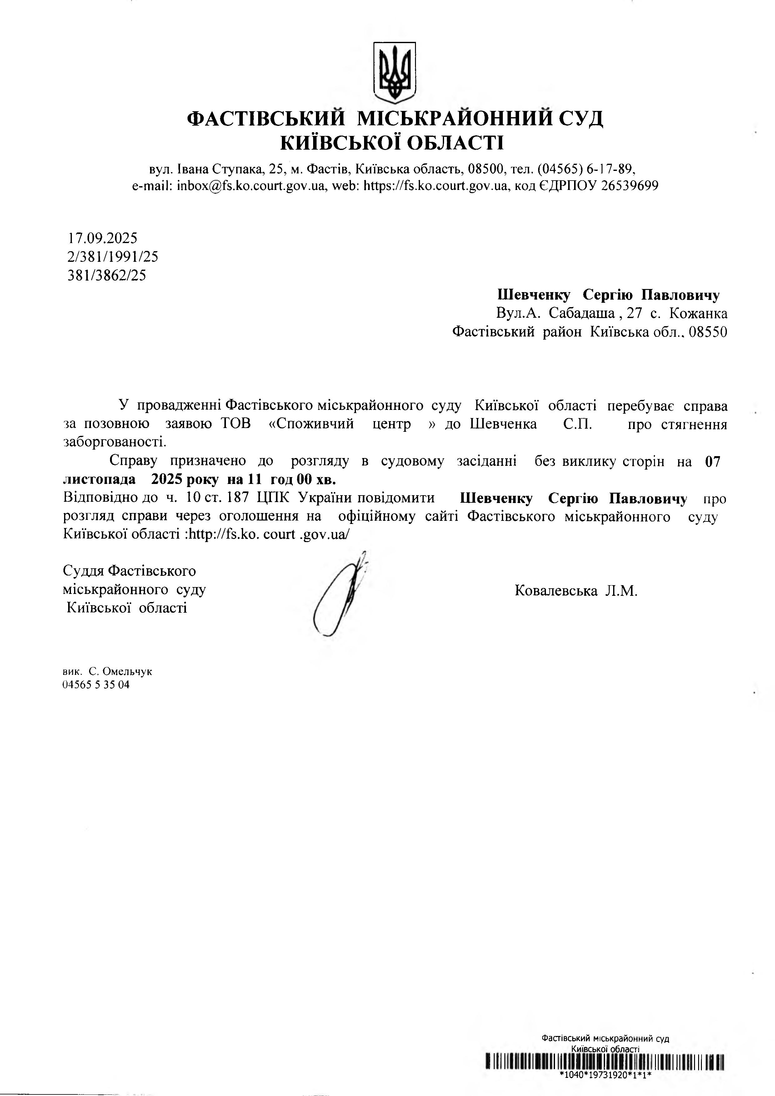 Шевченку Сергію Павловичу Вул.А. Сабадаша , 27 с. Кожанка Фастівський район Київська обл.. 08550