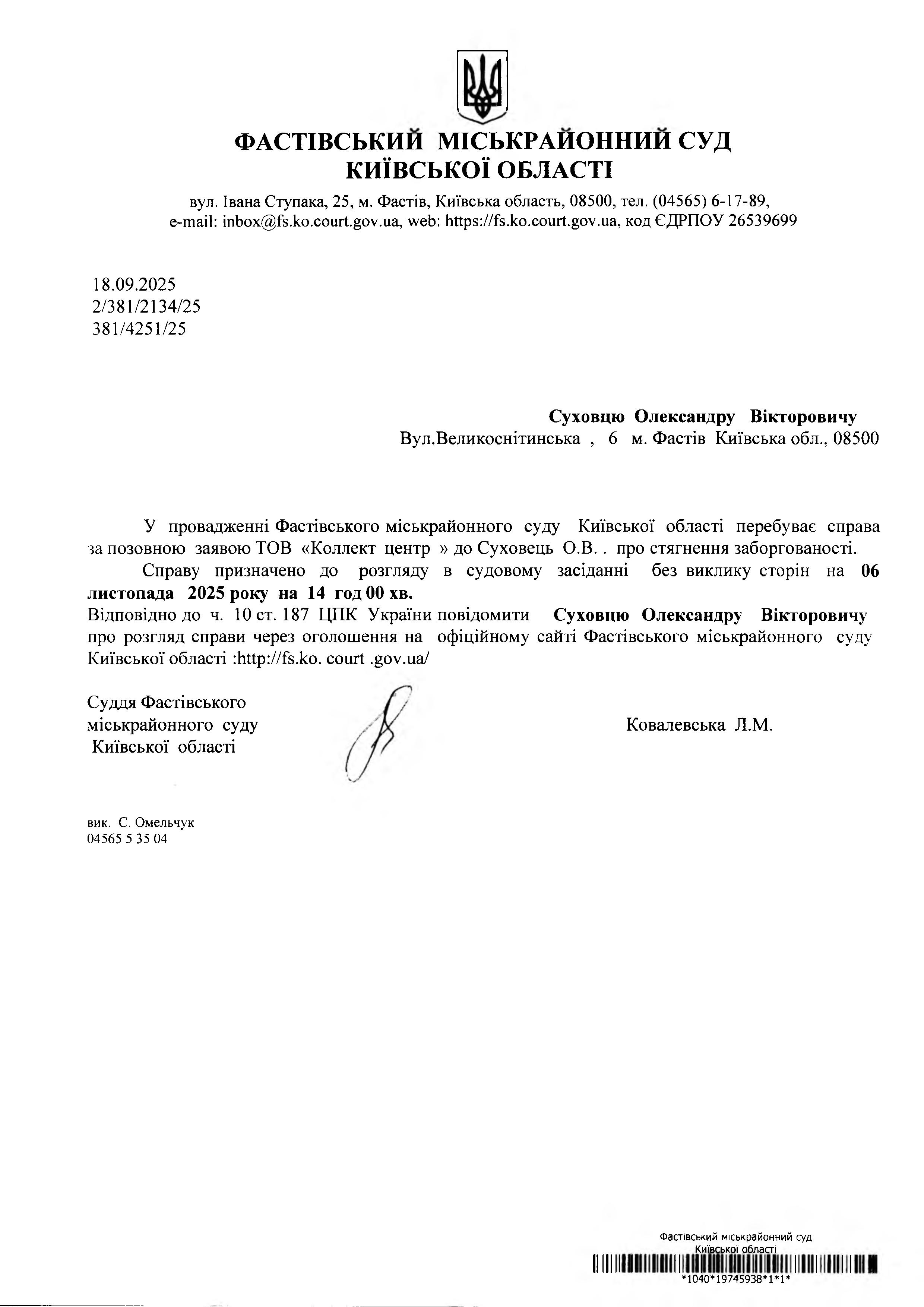 Суховцю Олександру Вікторовичу Вул.Великоснітинська , 6 м. Фастів Київська обл., 08500