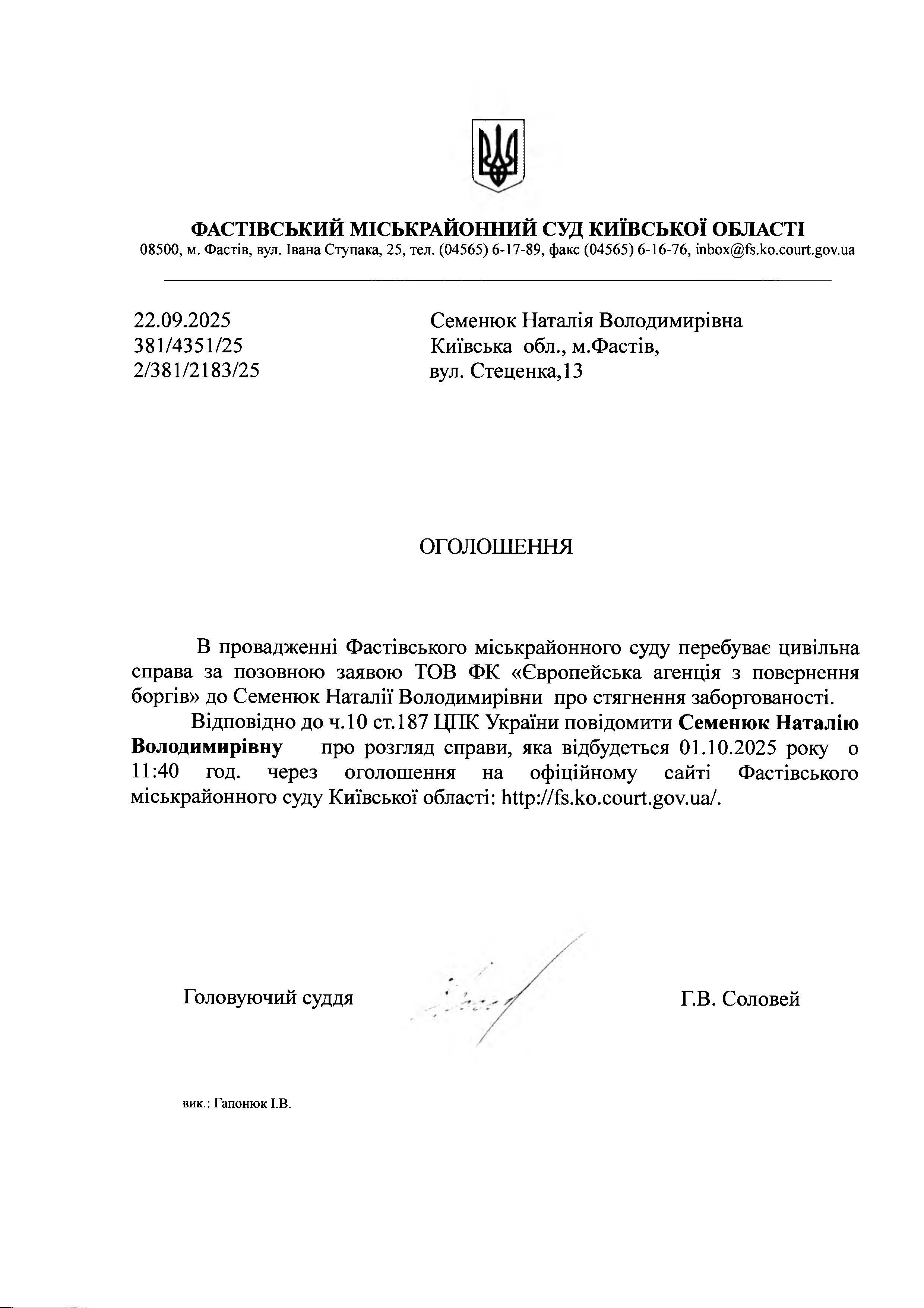 Семенюк Наталія Володимирівна Київська обл., м.Фастів, вул. СтеценкаДЗ