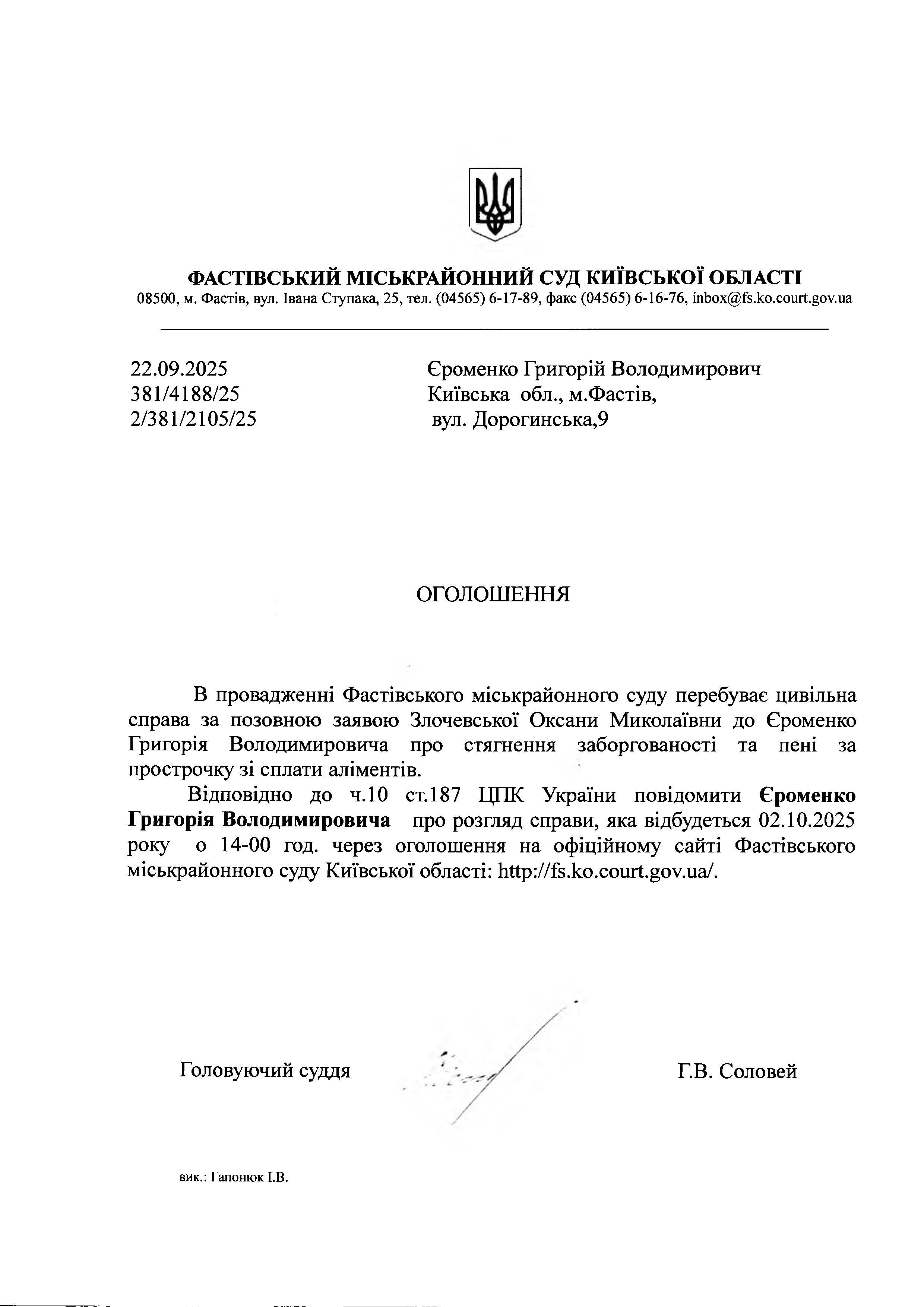 Єременко Григорій Володимирович Київська обл., м.Фастів, вул. Дорогинська,9