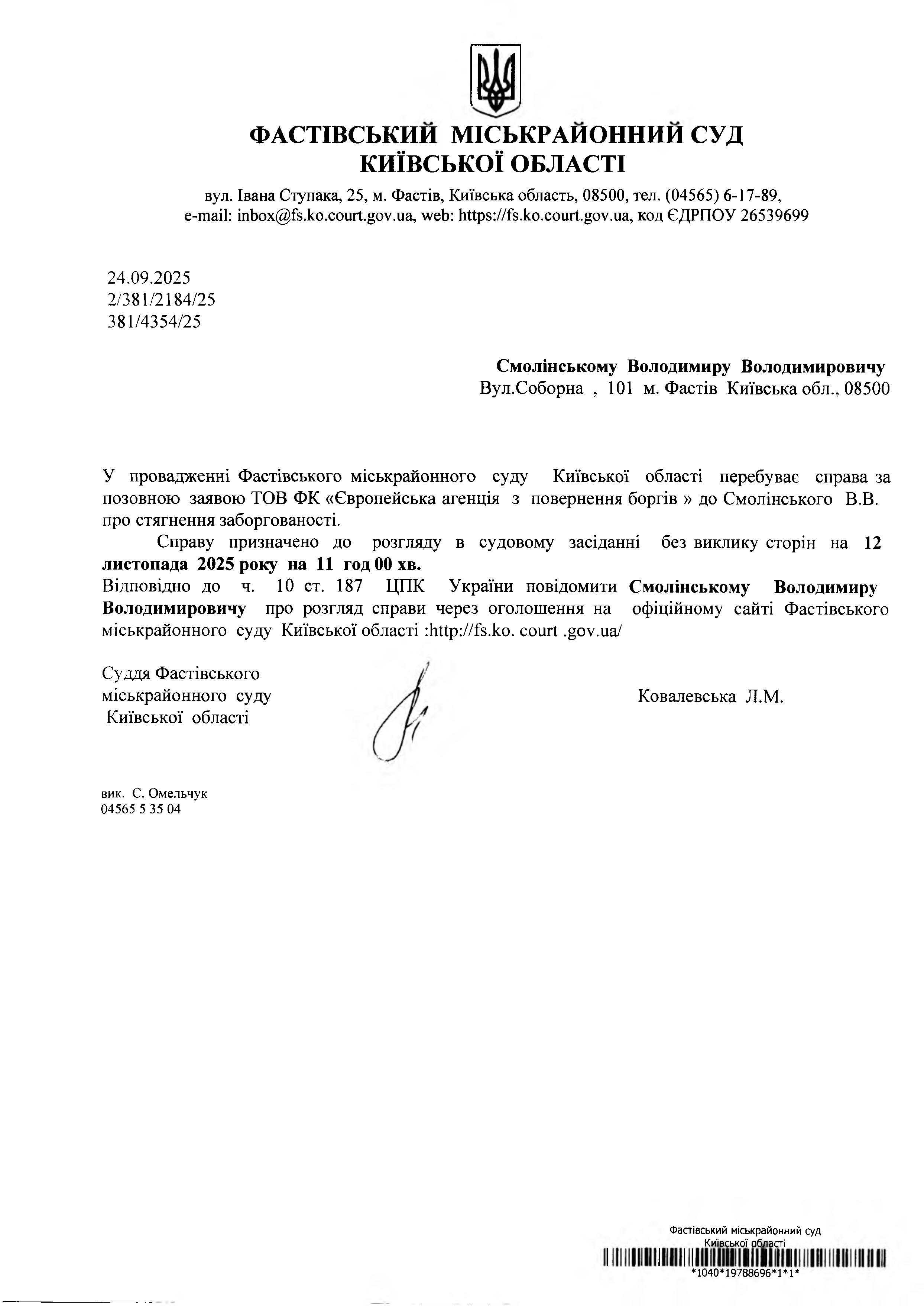 Смолінському Володимиру Володимировичу Вул.Соборна , 101 м. Фастів Київська обл., 08500