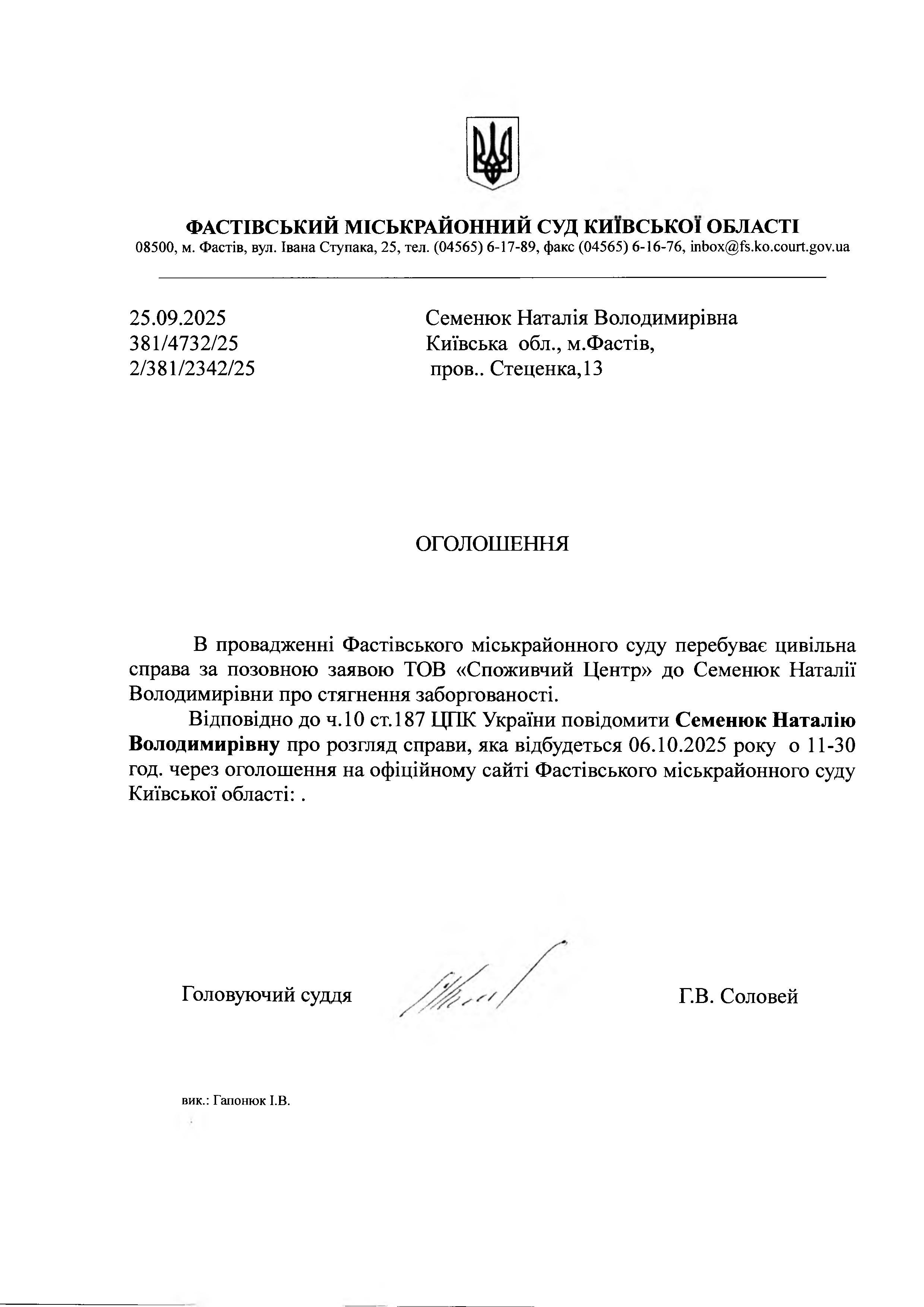 Семенюк Наталія Володимирівна Київська обл., м.Фастів, пров.. Стеценка 1З