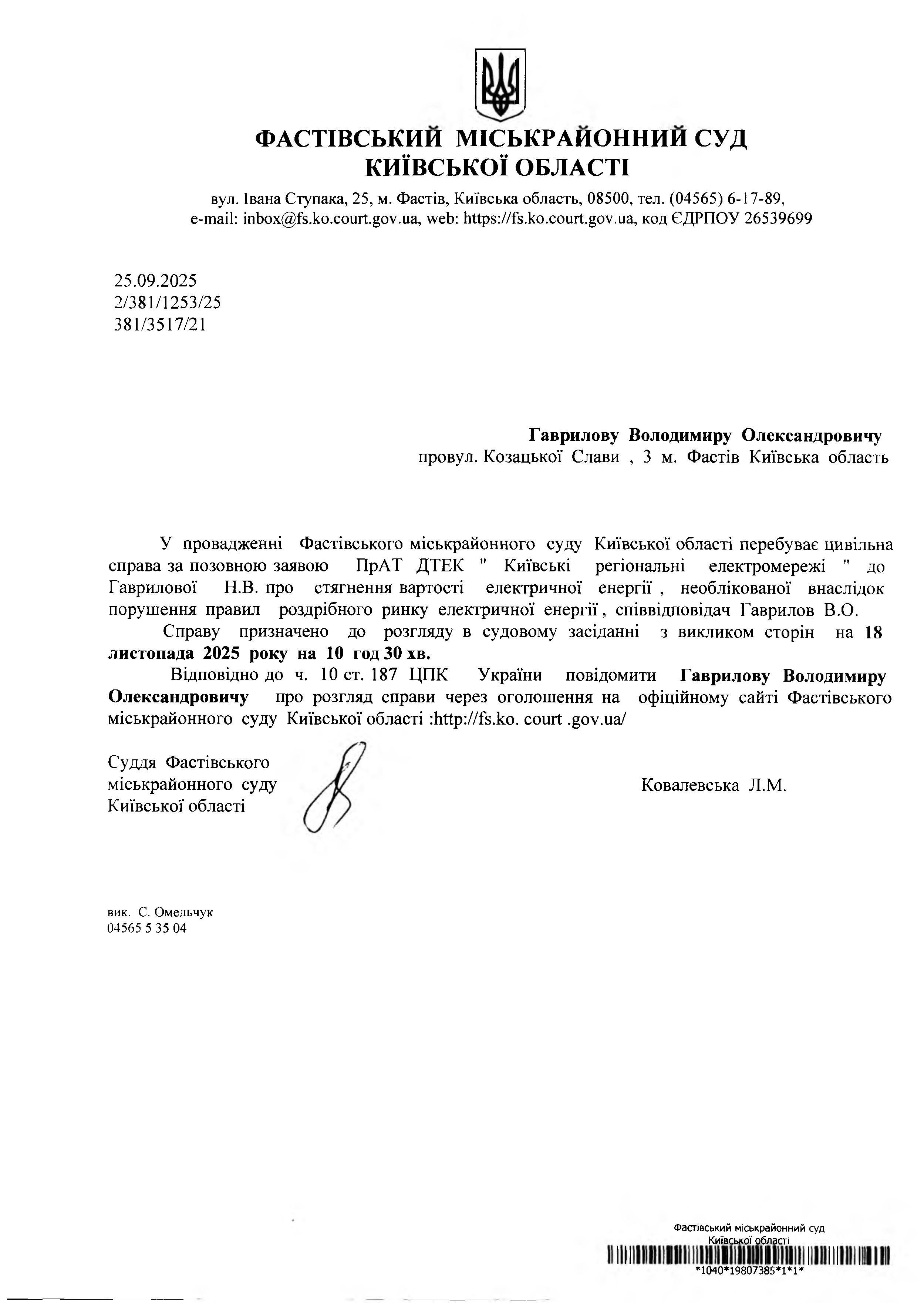 Гаврилову Володимиру Олександровичу провул. Козацької Слави , 3 м. Фастів Київська область