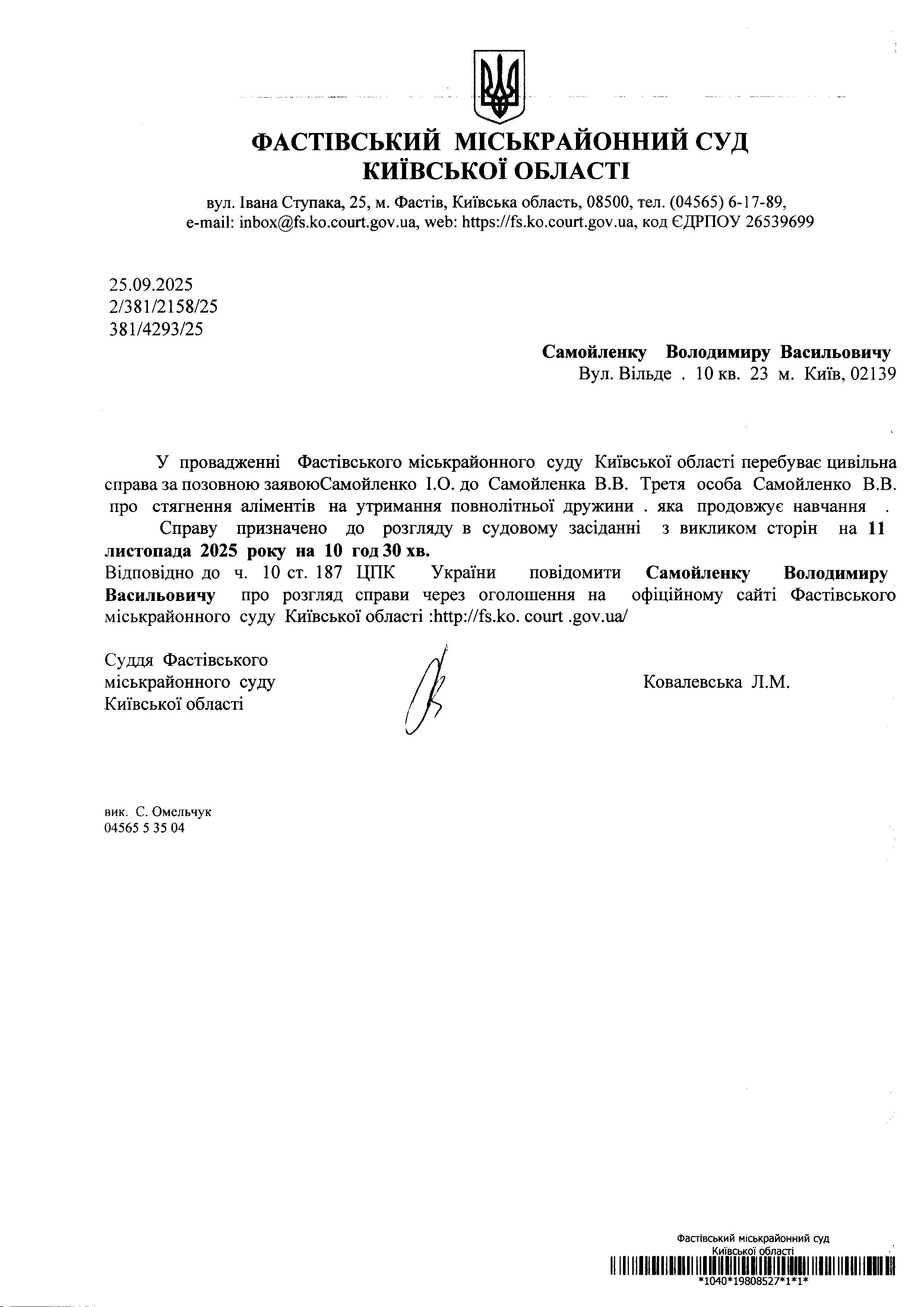 Самойленку Володимиру Васильовичу Вул. Вільде . 10 кв. 23 м. Київ, 02139