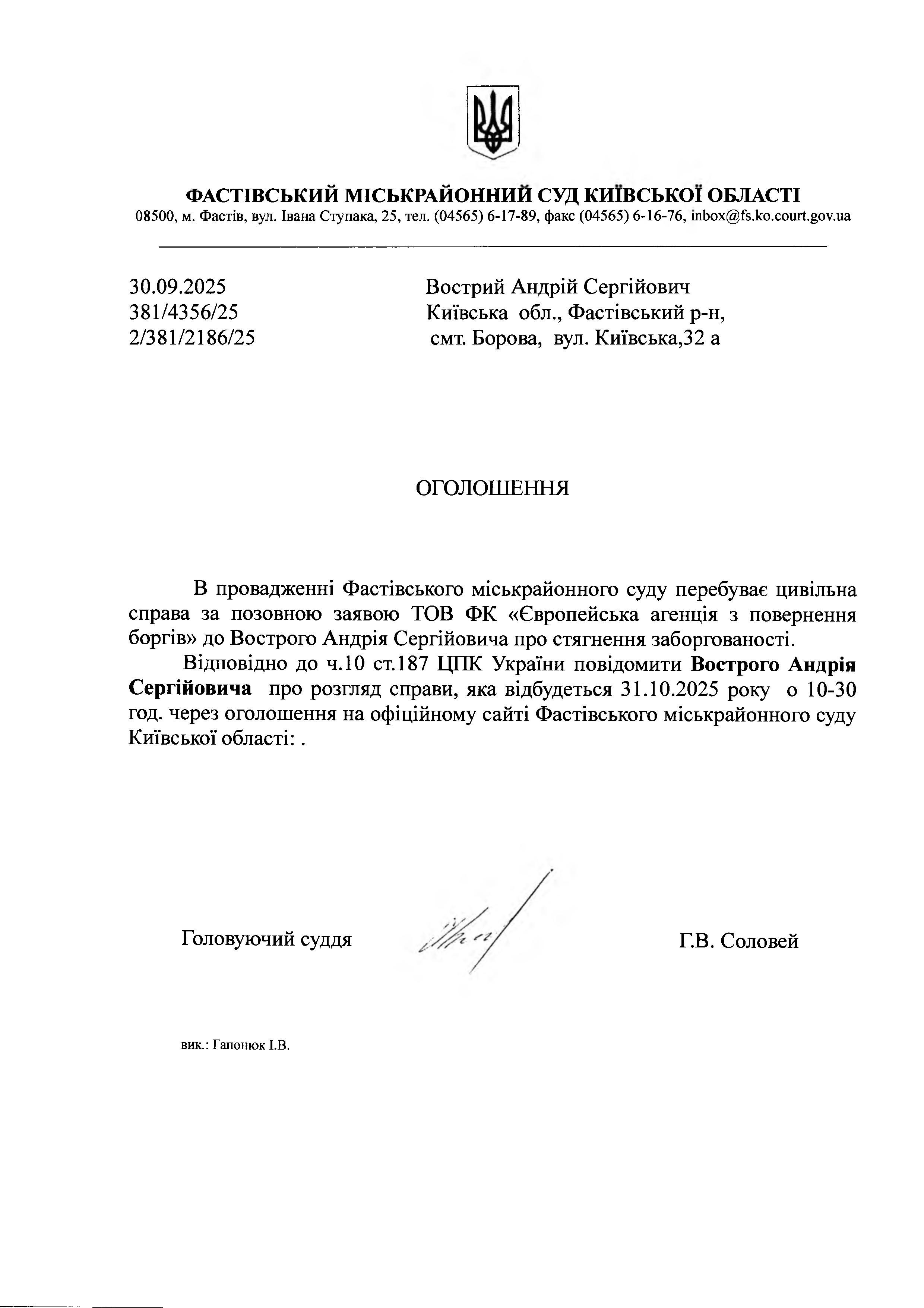 Вострий Андрій Сергійович Київська обл., Фастівський р-н, смт. Борова, вул. Київська,32 а
