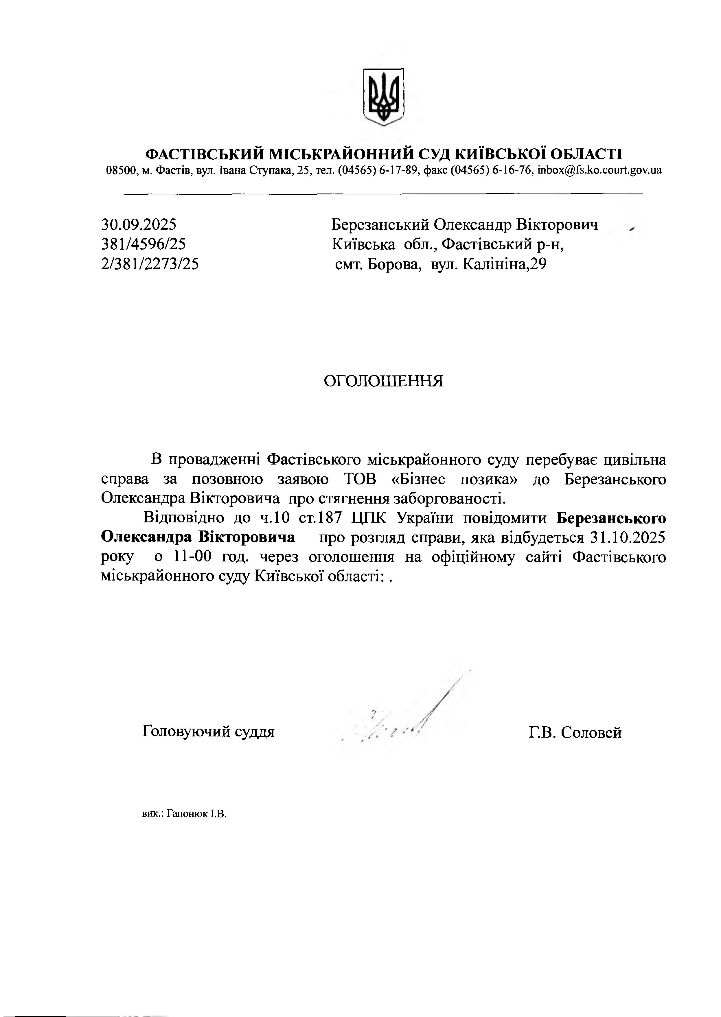 Березанський Олександр Вікторович Київська обл., Фастівський р-н, смт. Борова, вул. Калініна,29