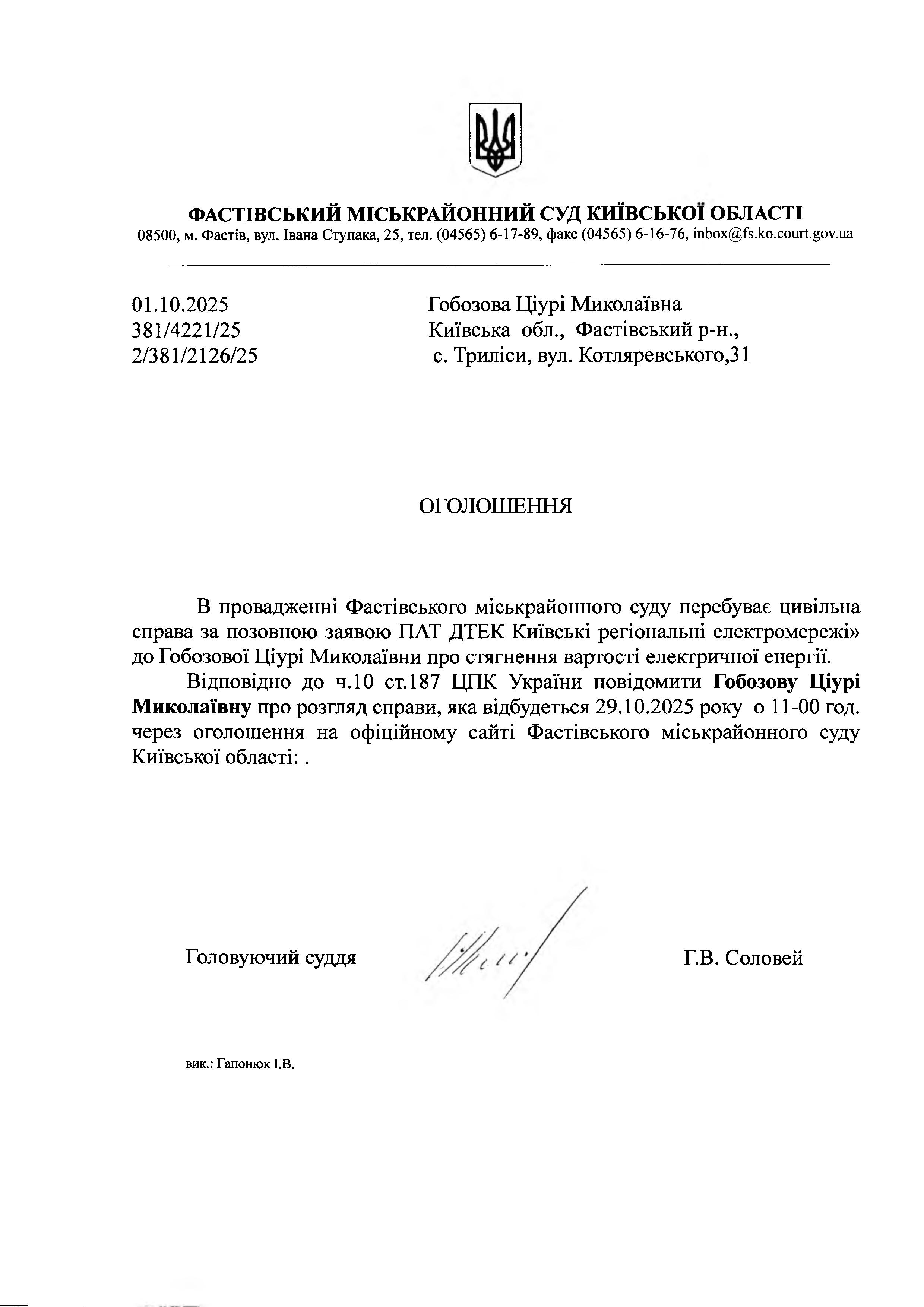Гобозова Ціурі Миколаївна Київська обл., Фастівський р-н., с. Триліси, вул. Котляревського,31