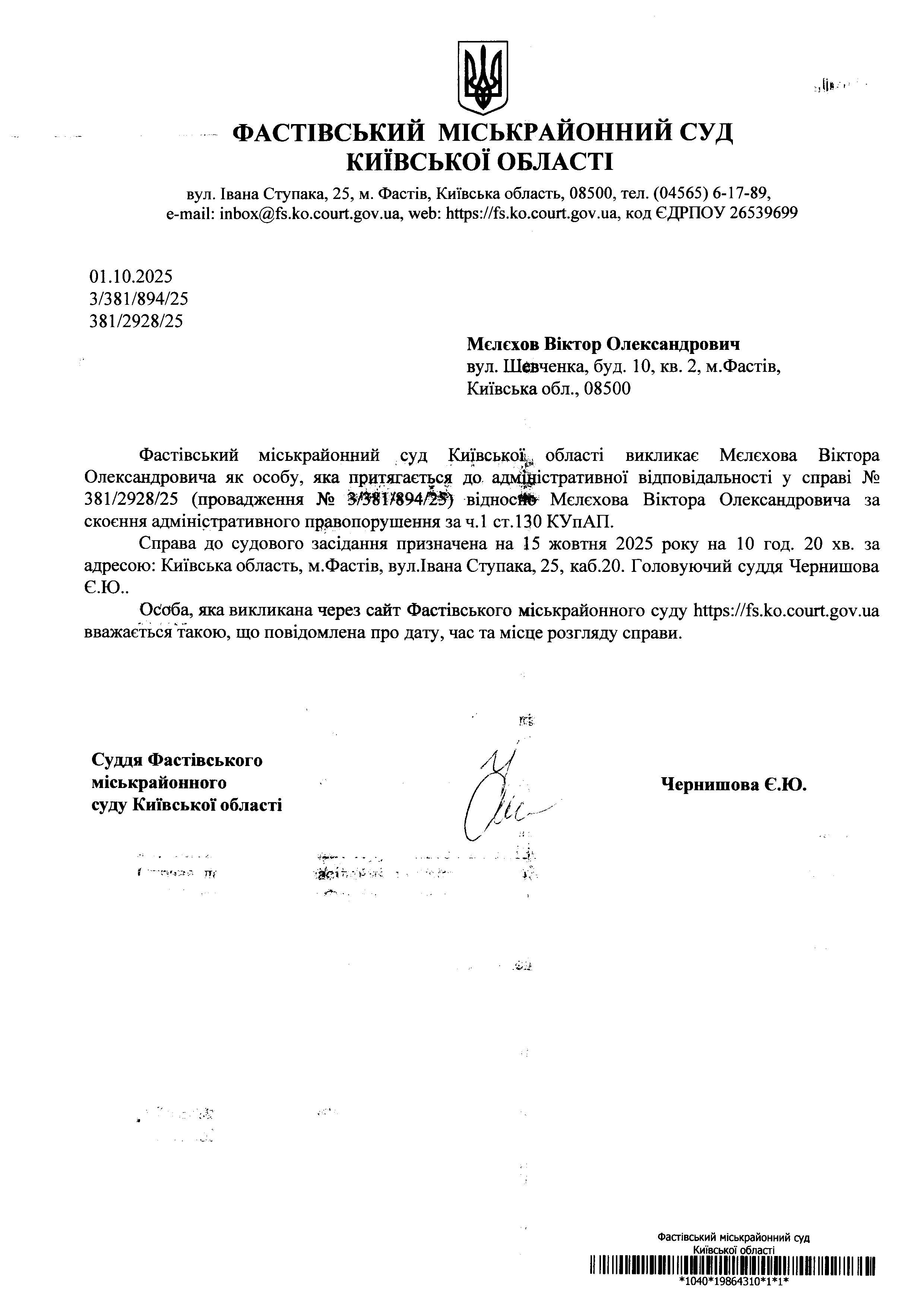 Мелехов Віктор Олександрович вул. Шевченка, буд. 10, кв. 2, м.Фастів, Київська обл., 08500