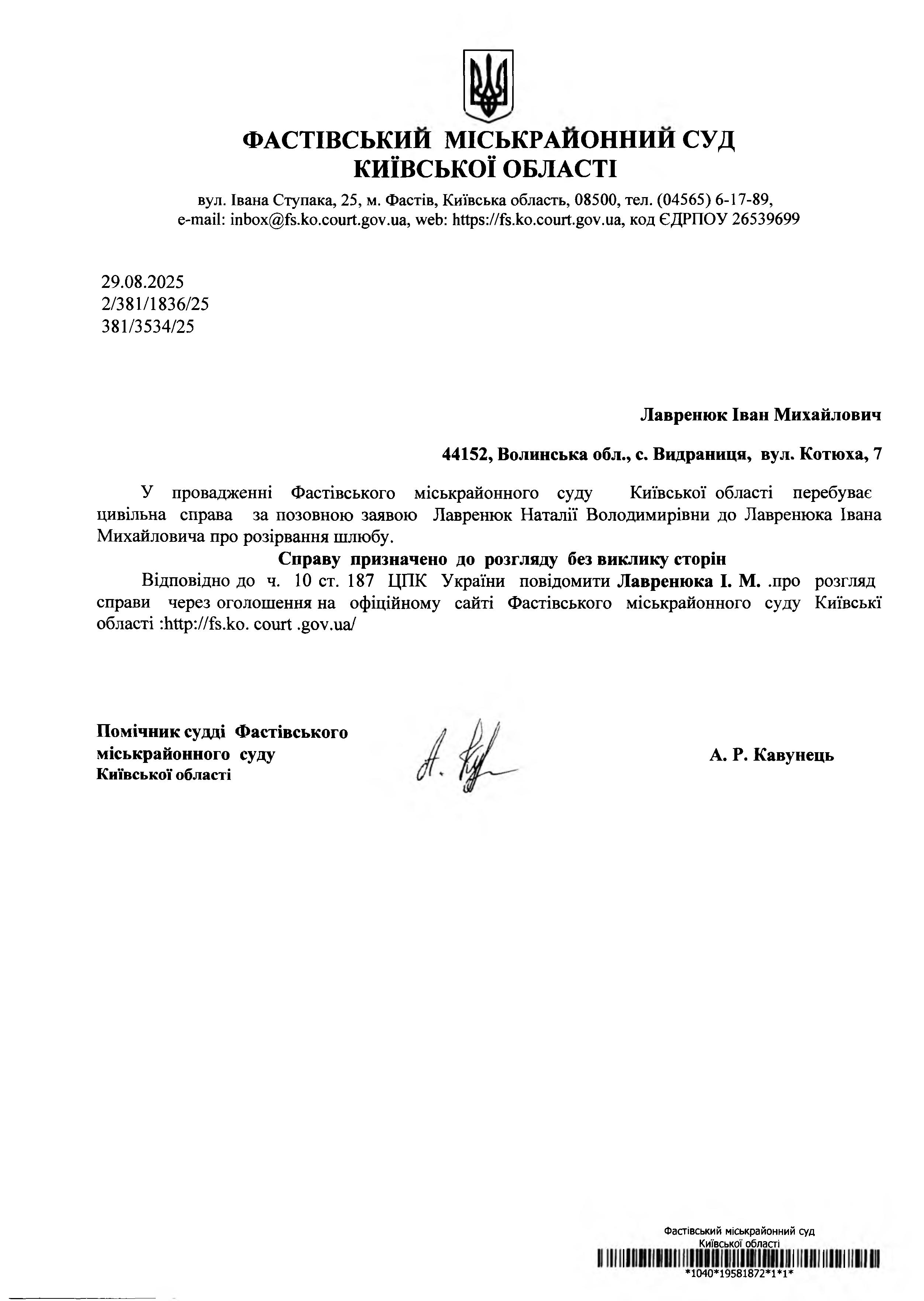 Лавренюк Іван Михайлович 44152, Волинська обл., с. Видраниця, вул. Котюха, 7