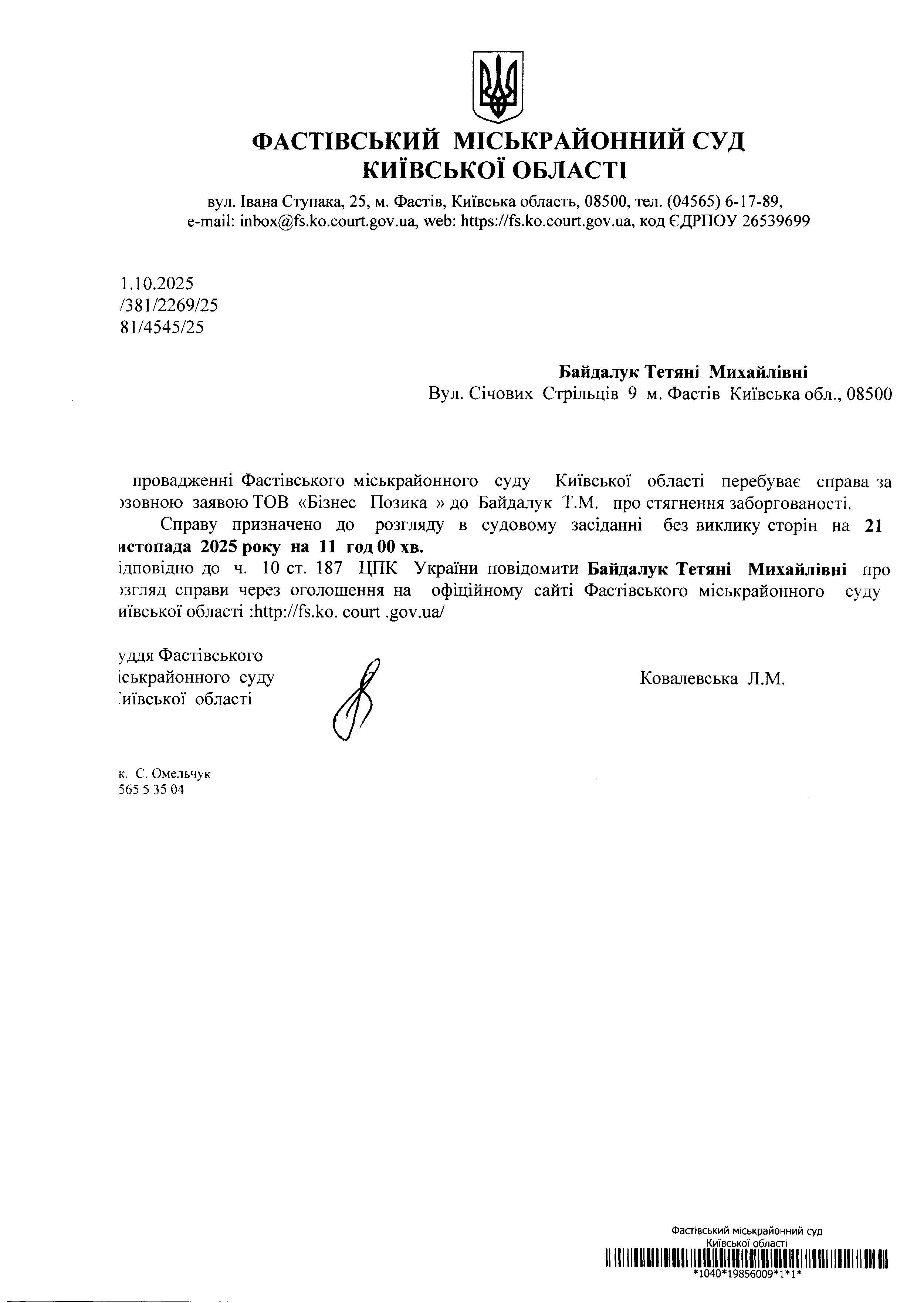 Байдалук Тетяні Михайлівні Вул. Січових Стрільців 9 м. Фастів Київська обл., 08500