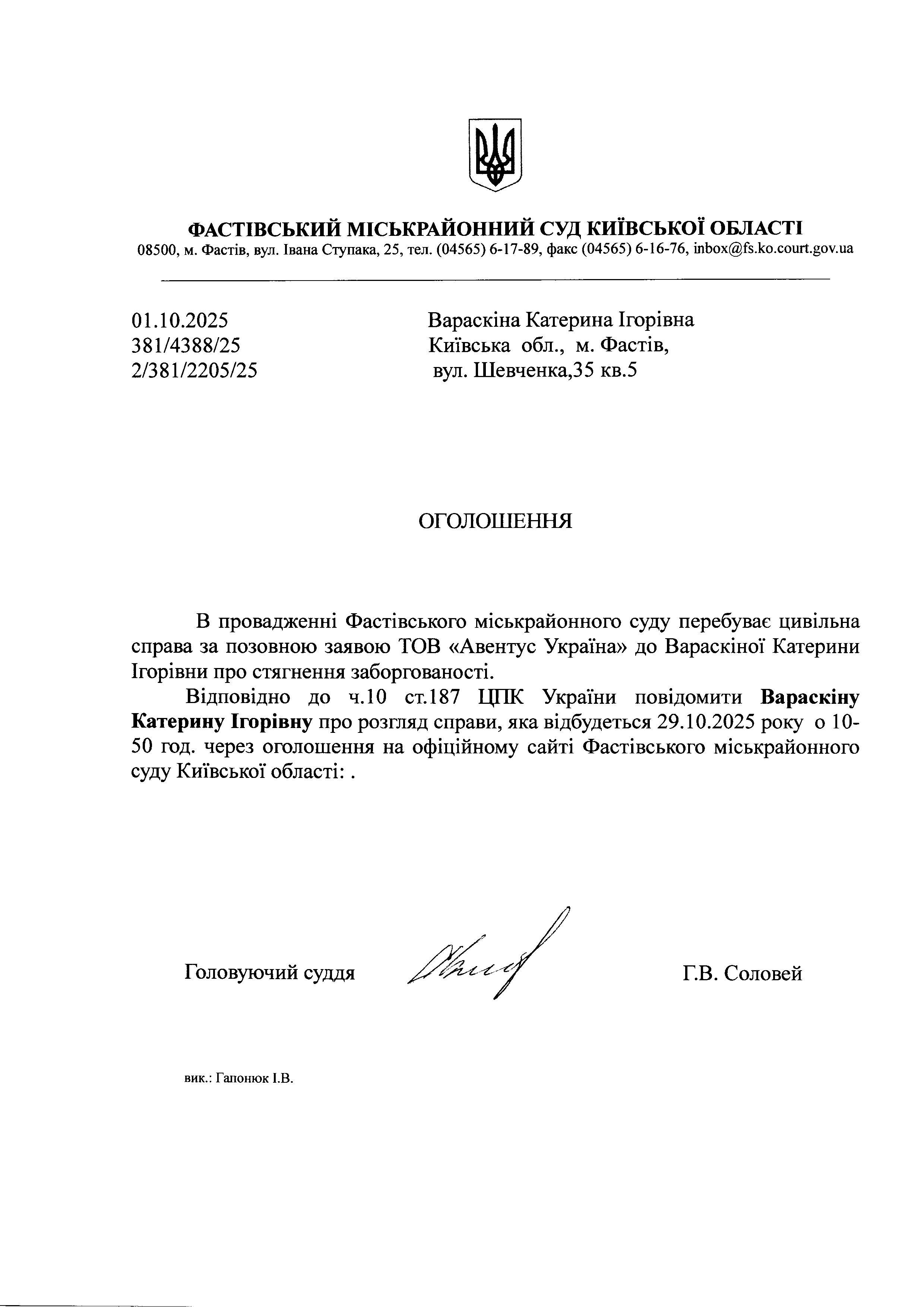 Вараскіна Катерина Ігорівна Київська обл., м. Фастів, вул. Шевченка,35 кв.5