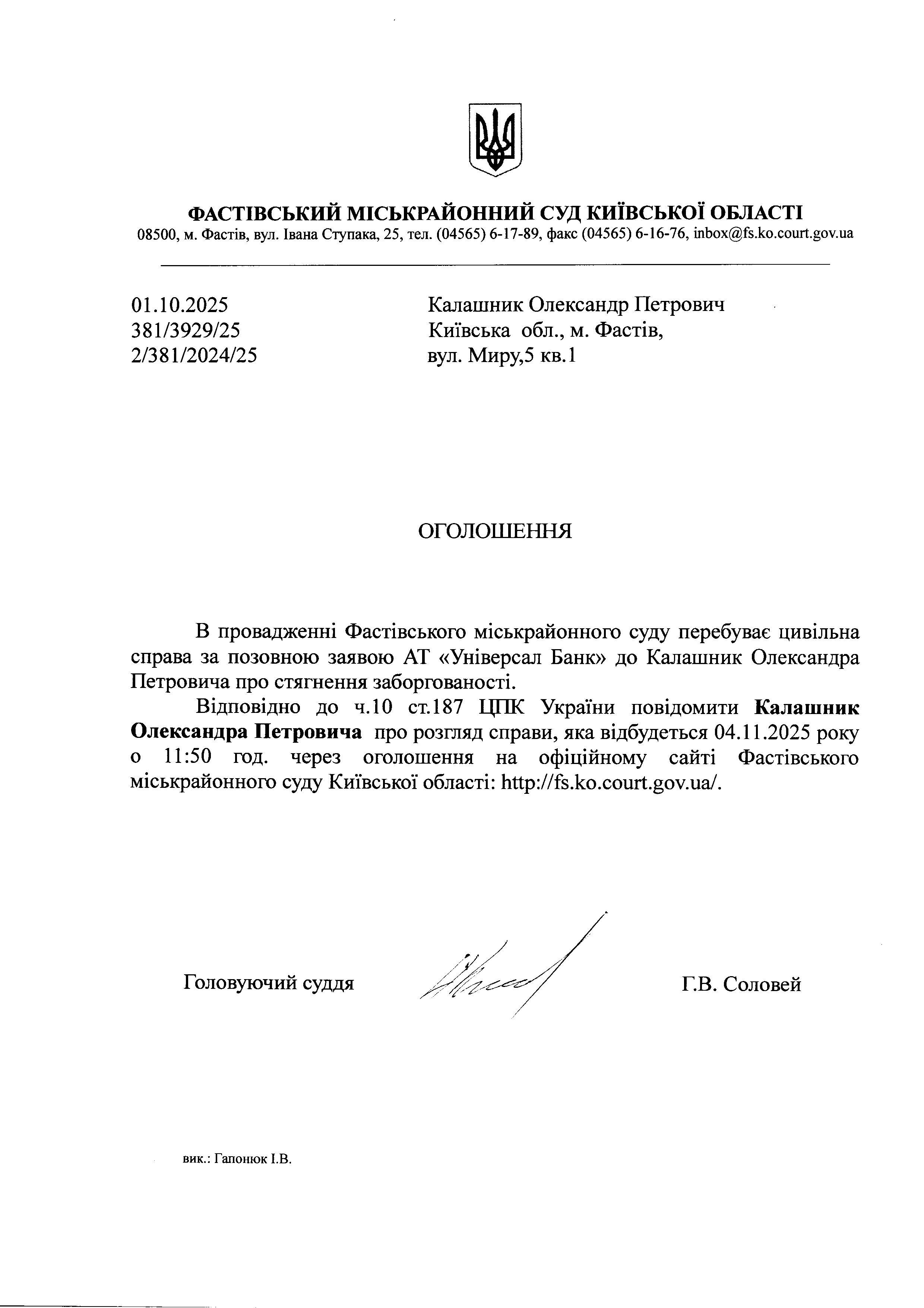 Калашник Олександр Петрович Київська обл., м. Фастів, вул. Миру,5 кв. 1