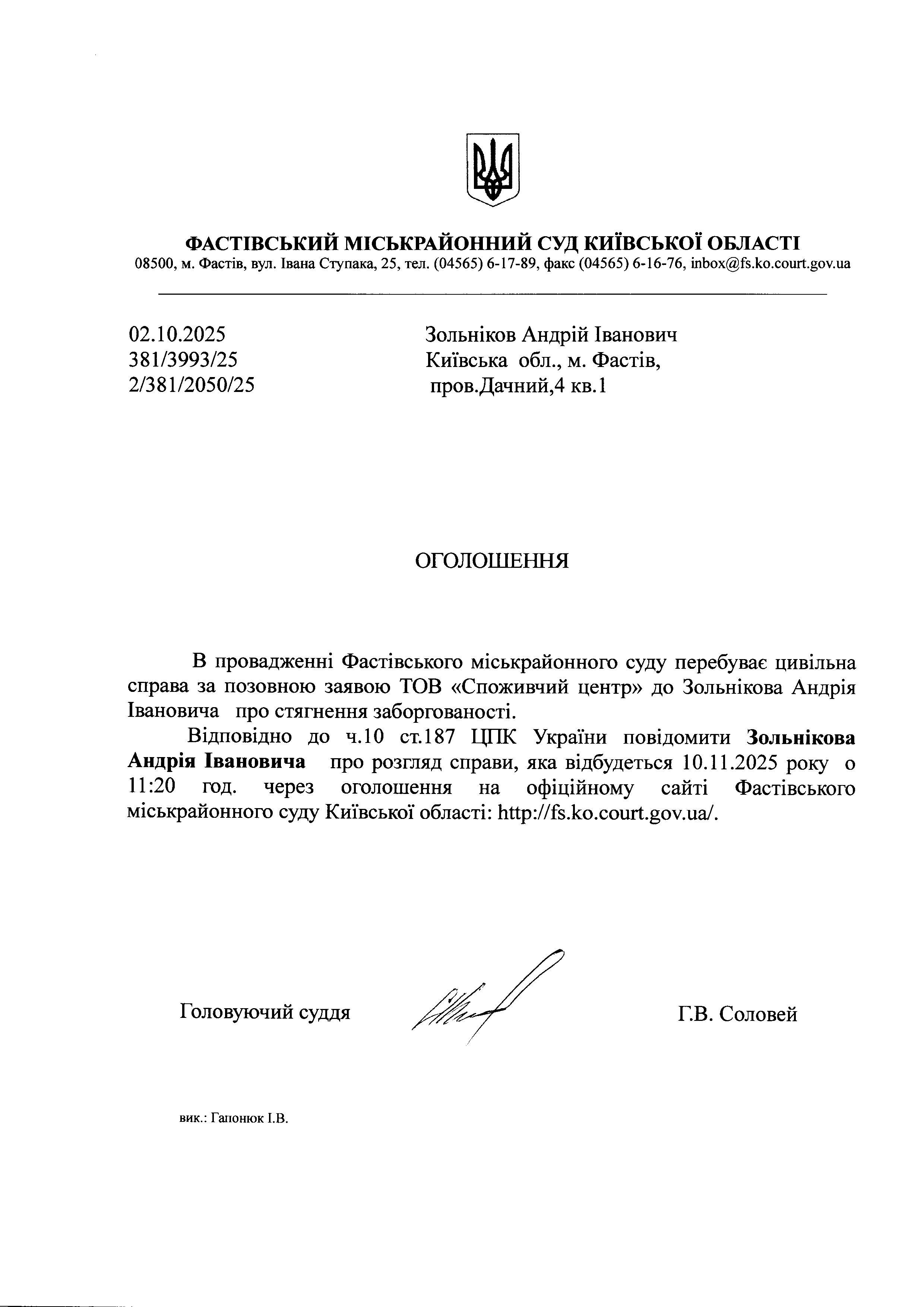 Зольніков Андрій Іванович Київська обл., м. Фастів, пров.Дачний,4 кв. 1