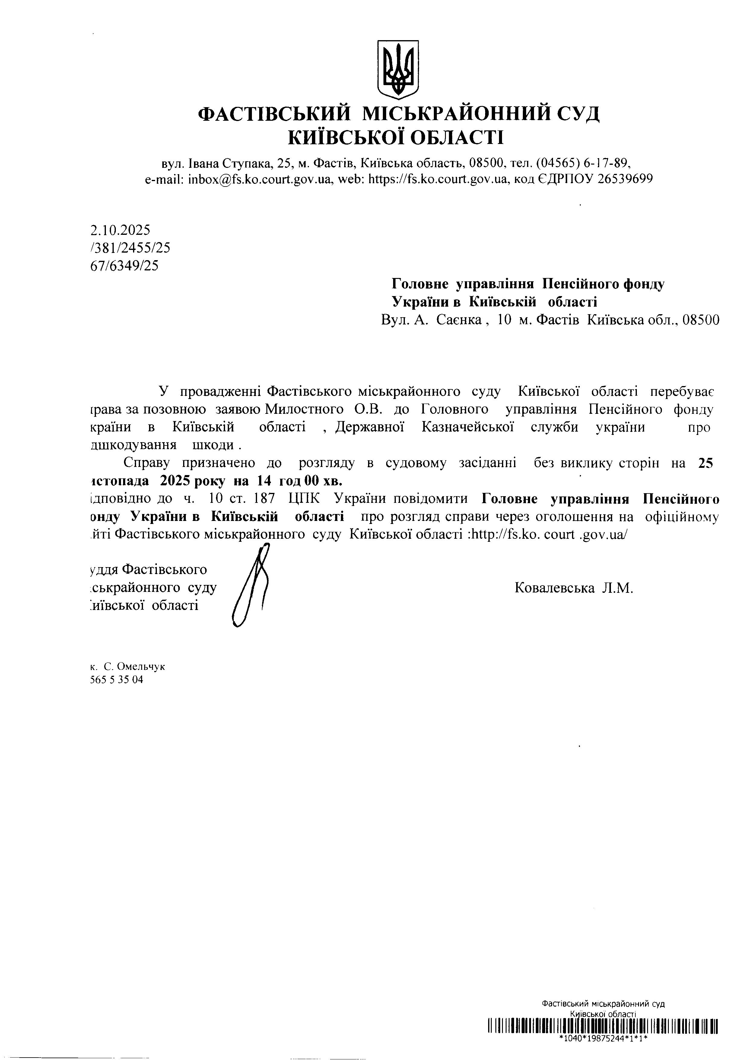 Головне управління Пенсійного фонду України в Київській області Вул. А. Саєнка, 10 м. Фастів Київська обл., 08500