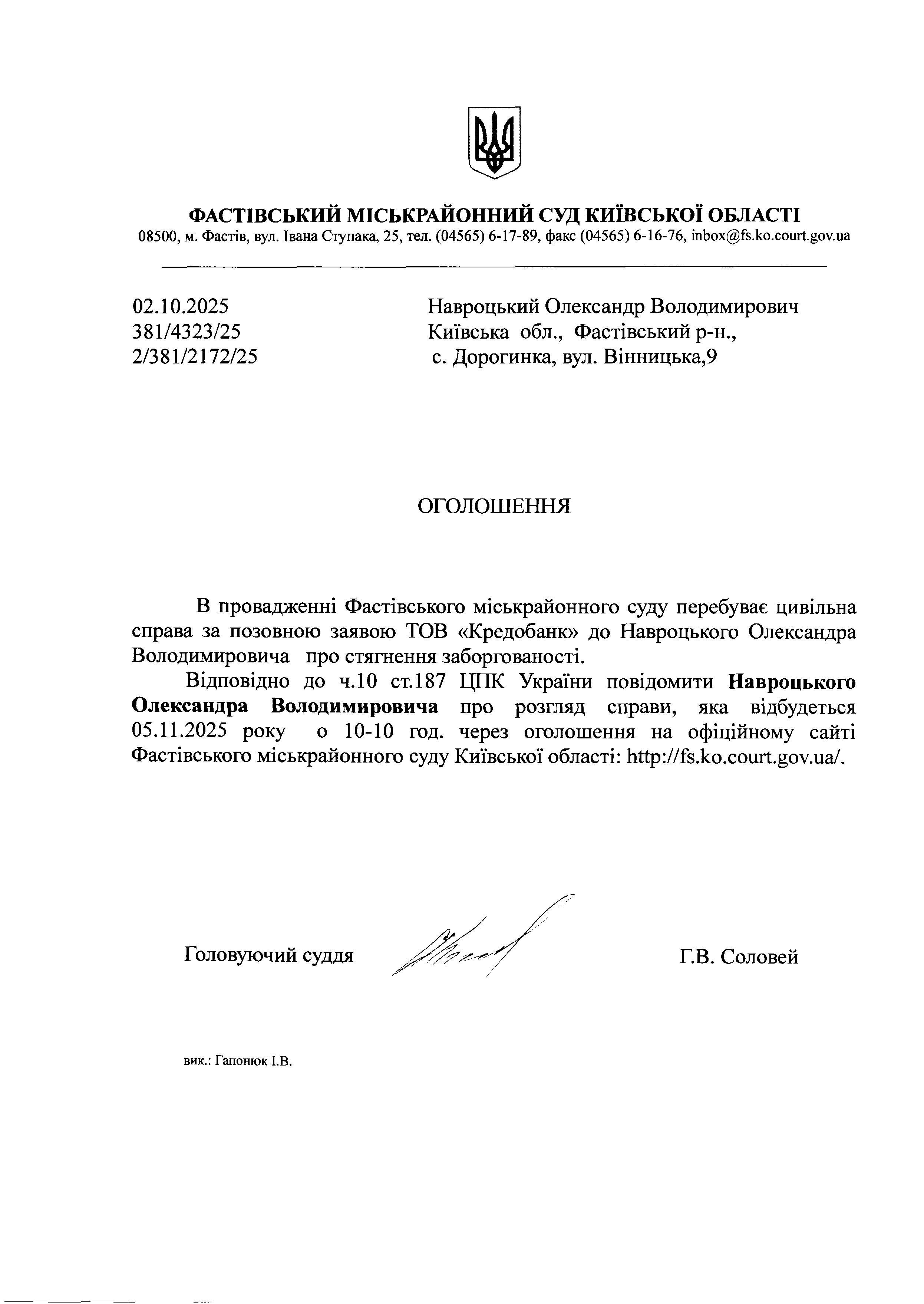 Навроцький Олександр Володимирович Київська обл., Фастівський р-н., с. Дорогинка, вул. Вінницька,9