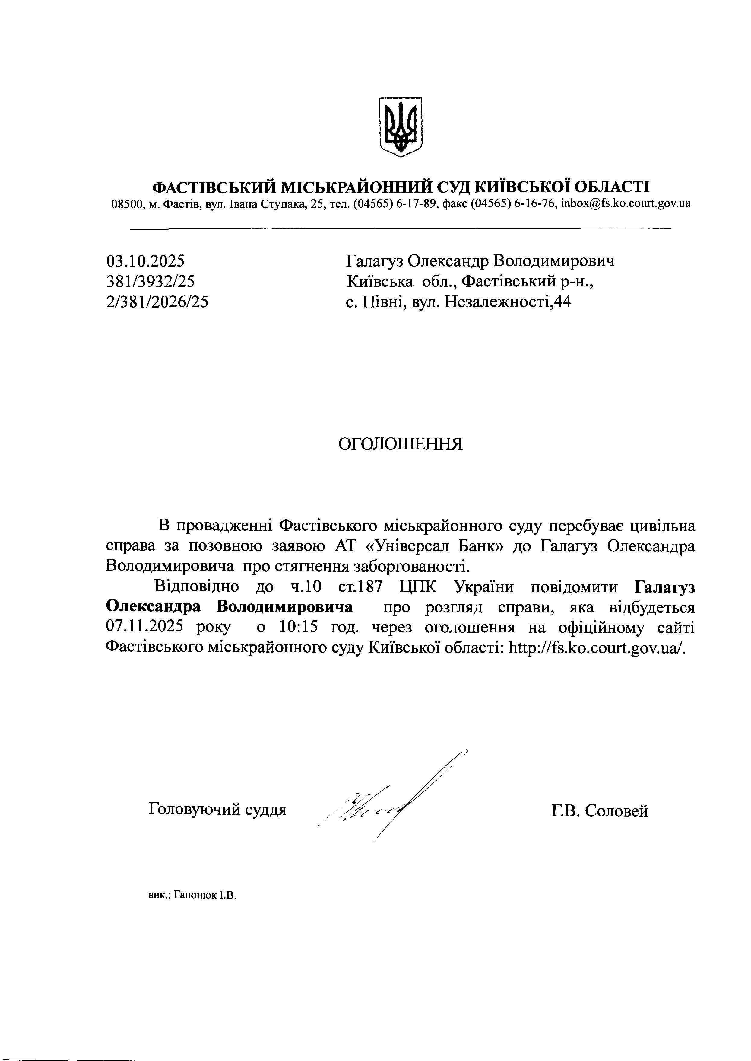 Галагуз Олександр Володимирович Київська обл., Фастівський р-н., с. Півні, вул. Незалежності,44